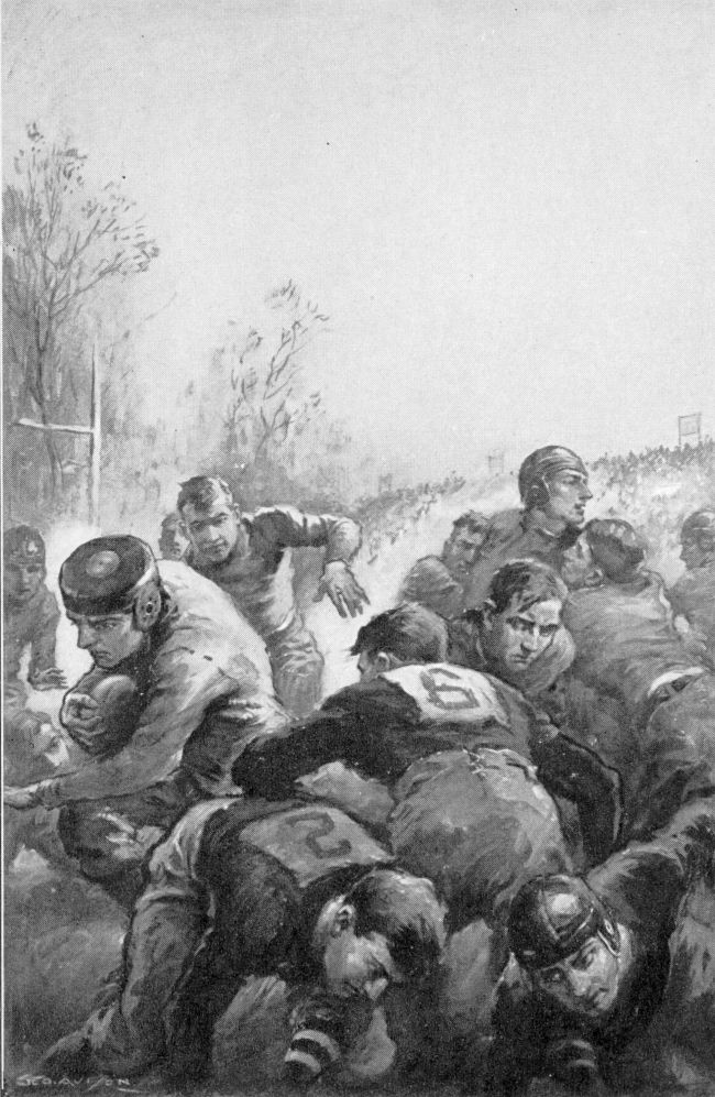 “Lots of other little stunts that you’ll absorb as you[6] come to ’em,” Merkle concluded; adding: “Of course, you’ll both be in the bridge scrap. You can’t do much but make a loud noise on the side-lines, because you’re not beefy enough”—meaning Dick; “but you”—with a nod for Larry—“you look fit enough to heave a locomotive off the track. Played on your High School eleven, didn’t you?”