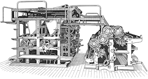 These folders, however, were only the commencement of a long series of experiments undertaken by the makers in the development of still faster printing and folding mechanisms, and from this time forward the progress made has been phenomenal. With great ingenuity, added to long experience, and by the acquisition and adaptation of every device which should aid them in their efforts, Hoe & Co. succeeded in providing machines of unrivalled designs, efficiency and speed.