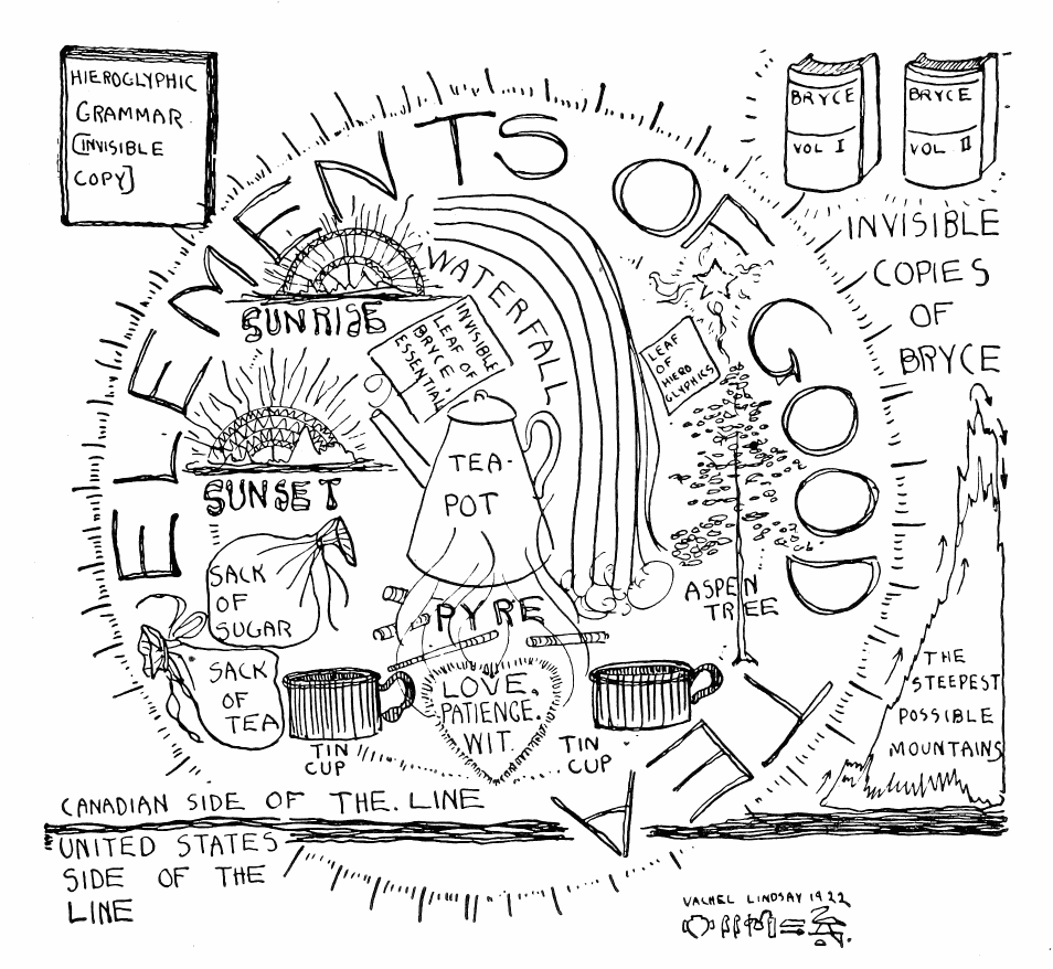 It would take more than the Encyclopædia Britannica to tell on how many points I differ from Stephen, and on how many points I agree with him. I had not the least idea that so much Lindsay was going into Graham’s fireside notes—while I was asleep at noon, often recovering in an hour from ten hours of restless, sleepless freezing by night. I do not hold myself liable in court for any opinions of mine then recorded by Graham. My daytime strength was not all given to thought, however, but often to trying to keep Graham in sight when he was a quarter of a mile ahead of me climbing mountains absolutely perpendicular. As I remember our first fireside discussions, they were as to whether there was actually such a person as Patrick Henry. Graham had an idea he was a perverse invention of my own fancy. But he looked him up afterwards and found there was such a man. As I remember our conversations after that provocation, I kept trying to deliver to him from memory Bryce’s American Commonwealth, unabridged, two volumes, one thousand pages each. I remember those volumes well. I read every page in lonely country hotels and on slow local trains while a Sunday field-worker for the Anti-Saloon League. And now invisible leaves{3} of Bryce often made the chief ingredient of our tea. So I have indicated in the design.