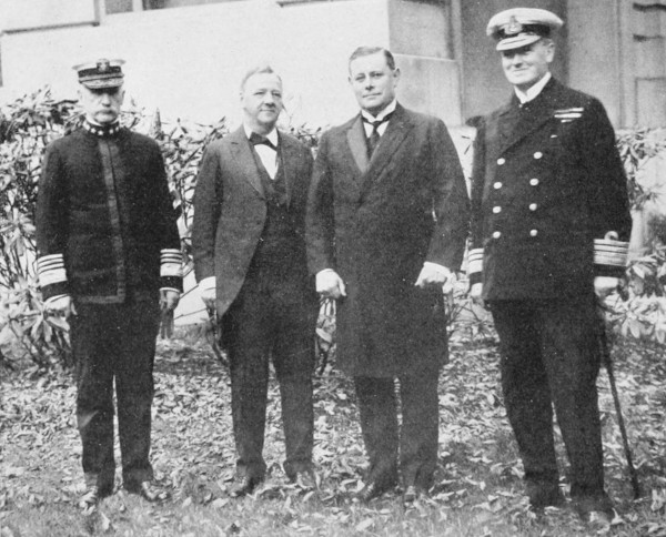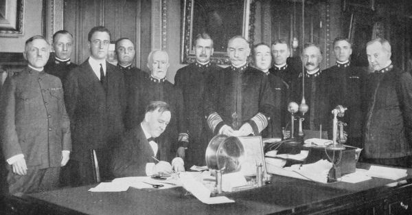 When this message was received by the Atlantic Fleet, at 1:33 p. m., Admiral Henry T. Mayo, Commander-in-Chief, hoisted on his flagship, the Pennsylvania, the signal, "War has commenced." At 5:50 o'clock he received the mobilization order, for which officers and vessels were so well prepared that Admiral Mayo said he did not have to "give a single order of any kind or description to pass the Fleet from a peace to a war basis." The entire Navy—Department, Fleet, yards and stations—was on a war footing within a few hours after war was declared. Complete instructions and plans, brought up to date, had been issued two weeks previous, and mobilization was completed without an hour's delay.