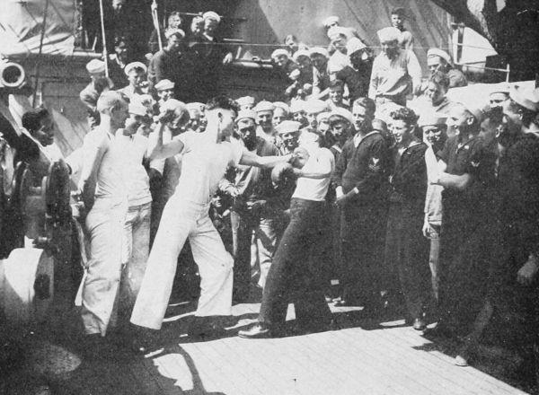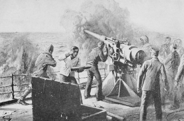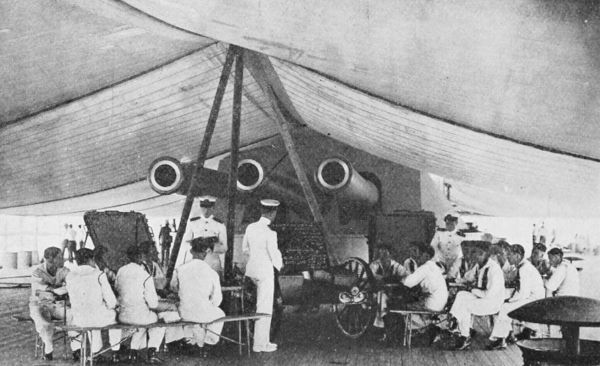 [4] When the break with Germany came the fleet was in Cuban waters, engaged in target practice, engineering exercises, and battle maneuvers. This intensive training had been going on under regular schedule for more than two years. Every man in the fleet, from the Commander-in-Chief to the youngest recruit, felt in his bones that the maneuvers that spring were a real preparation for war. Eager to get a chance at the Germans, confident that they could defeat any force of similar strength and tonnage afloat; they were just waiting for the word "Go!"