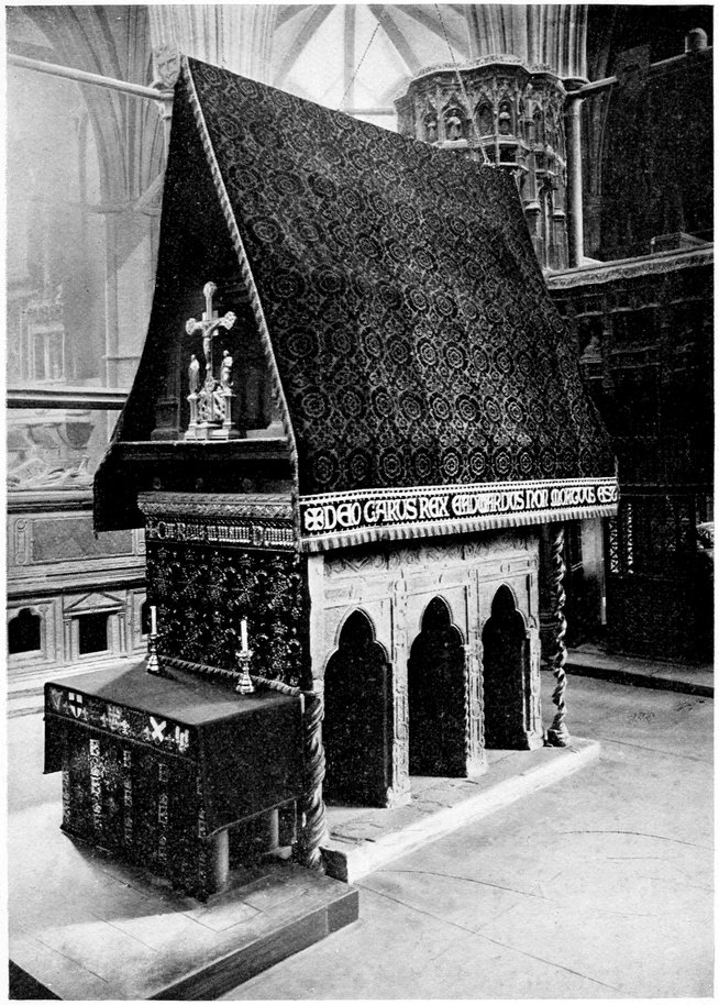 Another interesting bit of English history to be remembered in the Jerusalem Chamber is the banquet given to the French Ambassadors in 1624, by Lord Keeper Williams, then Dean of Westminster, in honour of Charles I’s marriage with Henrietta Maria of France. Dean Williams restored and decorated the room for this occasion, and on the cedarwood mantelpiece are small carved heads representing Charles I and his French bride.