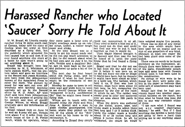| “Harassed Rancher Who Located ‘Saucer’ Sorry He Told About It,” Roswell Daily Record, July 9, 1947. | |
