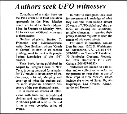 Nuclear physicist Stanton T. Friedman and aviation/science writer Don Berliner, whose “Crash at Corona” is now in its second printing, want to meet with people having knowledge of the 1947 crashes.