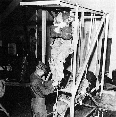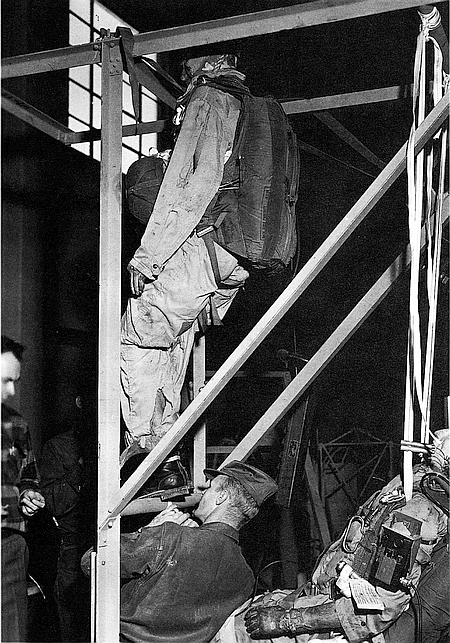 | Rope and Sandbag Parachute Drop Dummy Descending at Wright Field, Ohio. | |