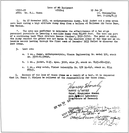 1. On 17 November 1955, an anthropomorphic dummy, B-15 jacket and a stop watch were lost during a high altitude dummy drop from a balloon at Holloman Air Force Base, New Mexico.
