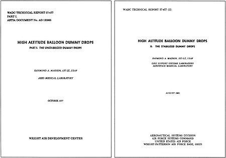 | Madson, Raymond A., 1st Lt. High Altitude Balloon Dummy Drops, II. The Stabilized Dummy Drops, WADC TR 57-477 (II), 1961. |