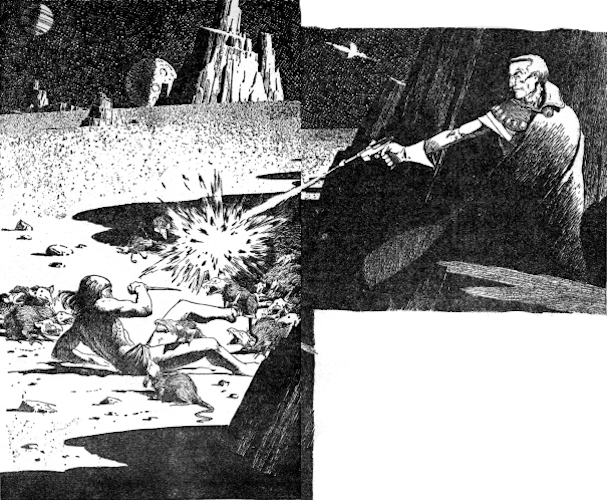 Without thinking Allyn brought his flame gun from its holster. Lances of bright death seared the gray ranks. Squeals died. The rats swerved from the fallen man, scattered. Retreat was a panic stampede. And soon their shrilling faded in the distance.