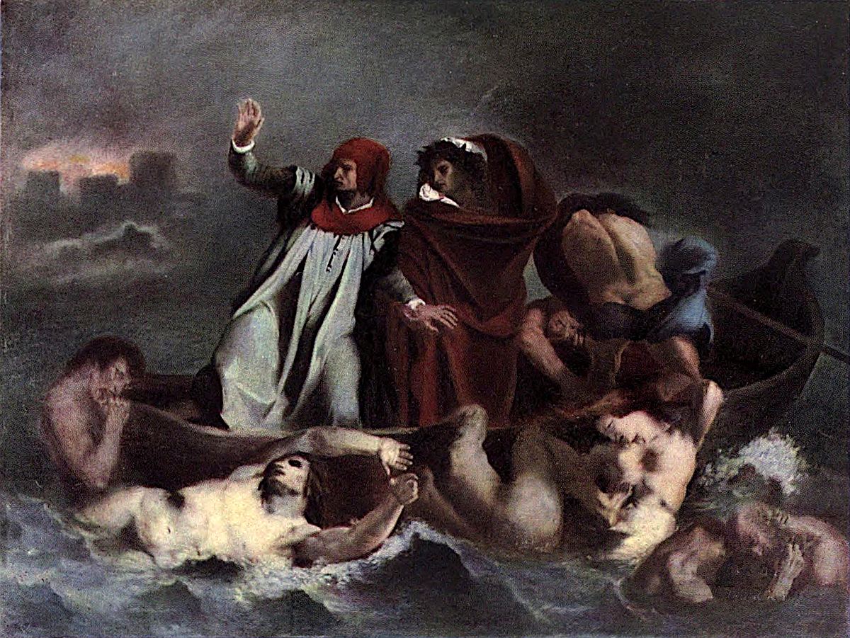 In a boat, steered by Charon across the river Styx, Virgil, laurel-crowned and dressed in a red cloak, holds with his right hand the left hand of Dante, who, in a blue cloak with a red hood, raises his right arm in a gesture of horror at the sight of the Damned, who, half-buried in the turbulent waters, cling despairingly to the sides of the boat. In the background are seen the towers of the burning city of Dite.