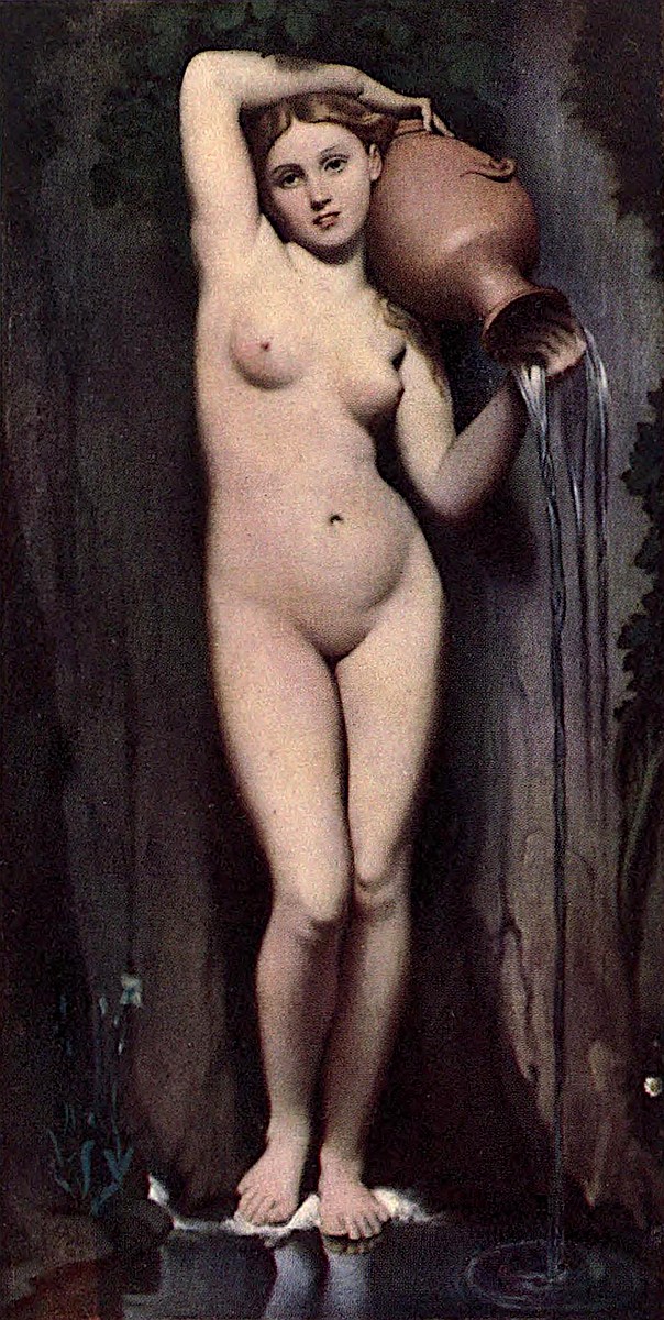 A nude figure of a fair-haired young maiden stands facing the spectator, the background being formed by a perpendicular rock partly overgrown with clinging plants. She raises her right arm over her head to hold the foot of a tilted vase, the mouth of which is supported by her left hand, and from which issues a streamlet of water that falls into a pool at the base of the rock, in which are reflected the feet of the maiden.
