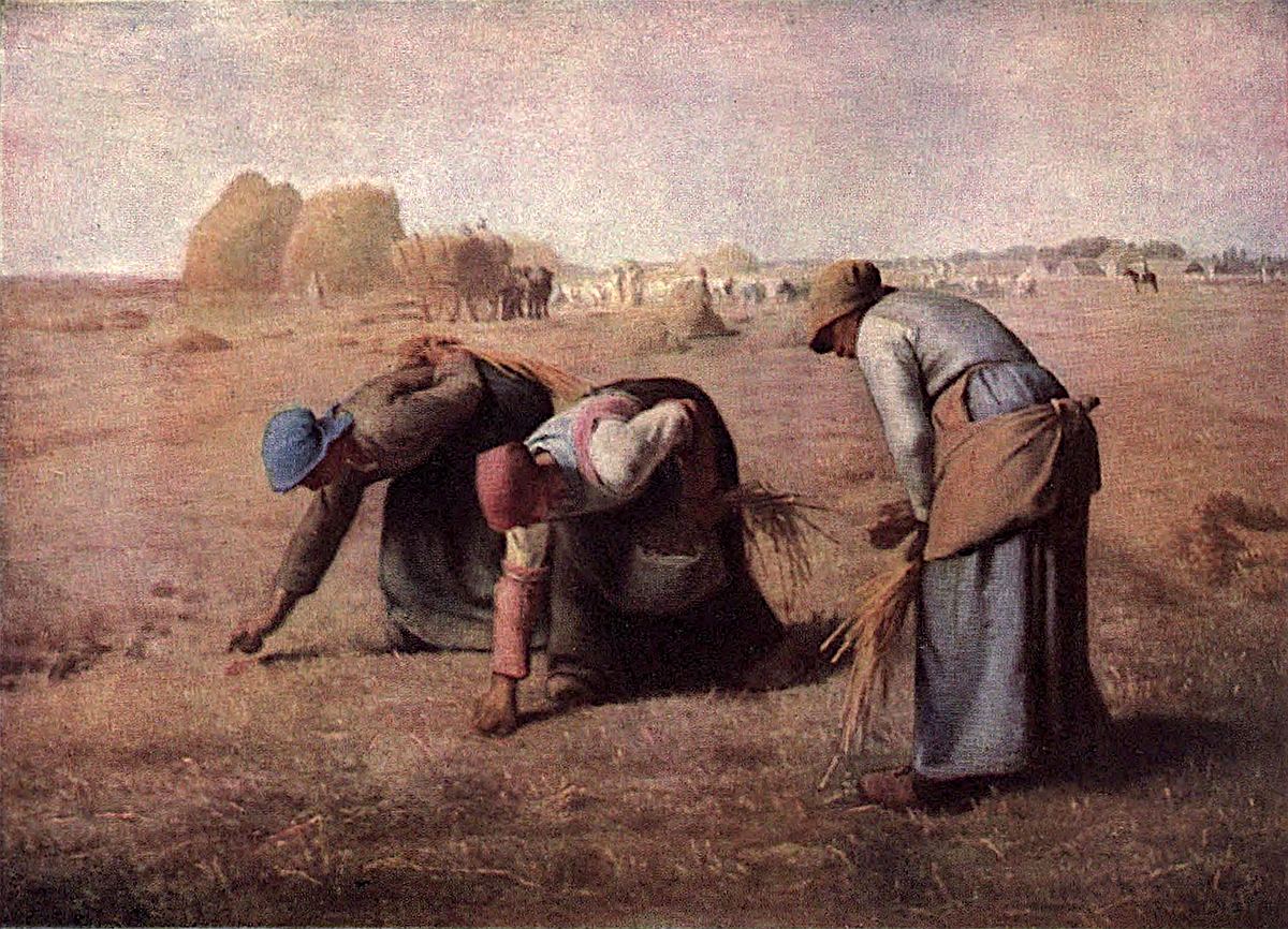 In a harvest-field three female gleaners, seen in profile to the left, are occupied with picking up blades of corn. Two of them are bending right down, with their right hands touching the ground; the third woman is half erect. In the background some ricks, a cart and horses, harvesters, a farm building, and a horseman.
