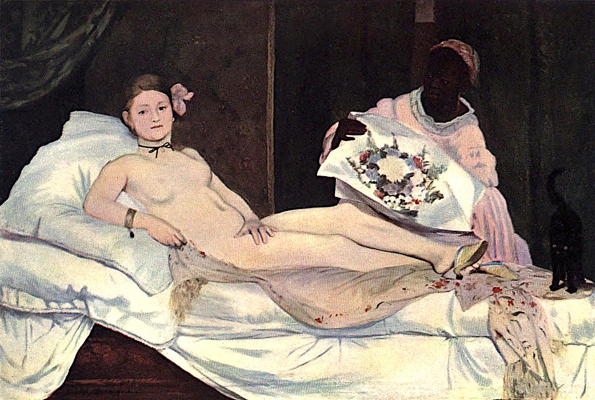 A nude woman, with blue-edged yellow satin slippers on her feet, a narrow black riband round her neck, and a gold bracelet on her right arm, is reclining on a bed, her right arm resting on the cushion. Beneath her is spread a yellowish, flowered Indian shawl. A black cat with raised tail stands at her feet on the bed. Behind the bed is seen a negress, who brings a large bouquet of flowers to her mistress.