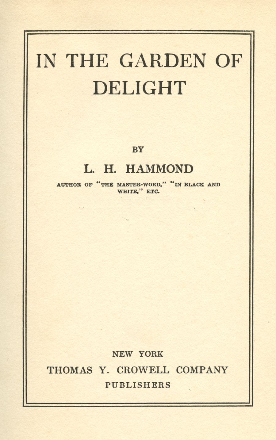 Project Gutenberg's In the Garden of Delight, by Lily Hardy Hammond This eBook is for the use of anyone anywhere in the United States and most other parts of the world at no cost and with almost no restrictions whatsoever. You may copy it, give it away or re-use it under the terms of the Project Gutenberg License included with this eBook or online at www.gutenberg.org. If you are not located in the United States, you'll have to check the laws of the country where you are located before using this ebook. Title: In the Garden of Delight Author: Lily Hardy Hammond Release Date: November 12, 2020 [EBook #63729] Language: English Character set encoding: UTF-8 *** START OF THIS PROJECT GUTENBERG EBOOK IN THE GARDEN OF DELIGHT *** Produced by Mardi Desjardins & the online Distributed Proofreaders Canada team at https://www.pgdpcanada.net