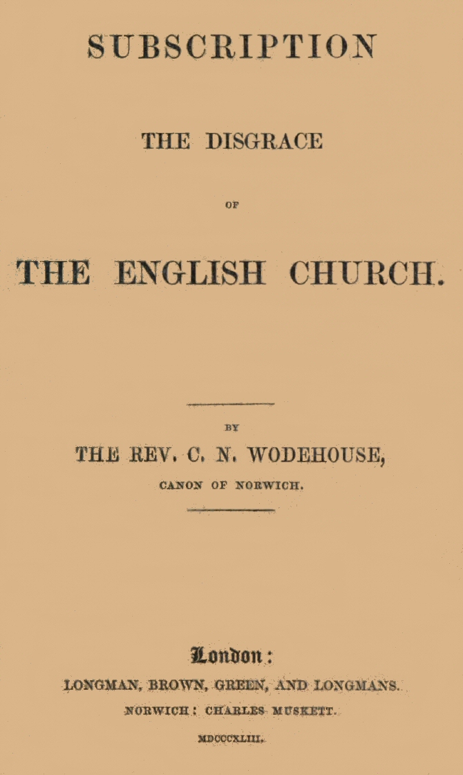 In a former publication on the Meaning of Subscription, [41] occasioned by the extreme uncertainty and perplexity in which this subject is involved, I stated my readiness to resign my preferment, if called upon to do so within a certain time by His Grace the Archbishop of Canterbury. That call has not been made. It may, however, be supposed that the remarks now offered on the same subject are published, not so much with a view to any general improvement as from a desire to obtain relief for my own difficulties. I wish therefore distinctly to state that this is not the case, and that those difficulties are removed, for the present, on the following grounds.