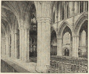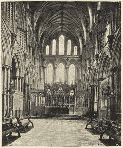 But the original Norman cathedrals were not only small and inconvenient to the east, but they were throughout very badly lighted; a very large amount of history, as I have tried to point out in speaking of Gloucester, Hereford, and Norwich, consists of attempts to improve the lighting of the cathedral. Sometimes, indeed, the improvement took the shape of total destruction of the old gloomy church, and its replacement by a brilliantly illuminated successor, as at York. Connected with this was the mania for an increased acreage of stained glass—an æsthetic motive which, however, had its practical side; the stained glass justifying itself to the monks and canons as providing a series of lessons in Scripture history or Church history.