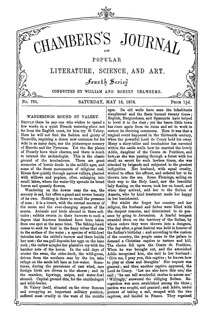 Should there be any one who wishes to spend a few weeks in a quiet French watering-place not far from the English coast, let him try St Valery. Here he will not find the fashion and gaiety of Trouville, requiring a dozen new costumes for his wife in as many days, nor the picturesque scenery of Biarritz and the Pyrenees. Yet the flat plains of Picardy have their charms, and there is much to interest the archæologist. This is the classic ground of the troubadours. There are great memories of heroic deeds in the middle ages, and some of the finest monuments of religious zeal. Rivers flow quietly through narrow valleys, planted with willows and poplars, often enlarging into small lakes, where the water-lily spreads its broad leaves and queenly flowers.