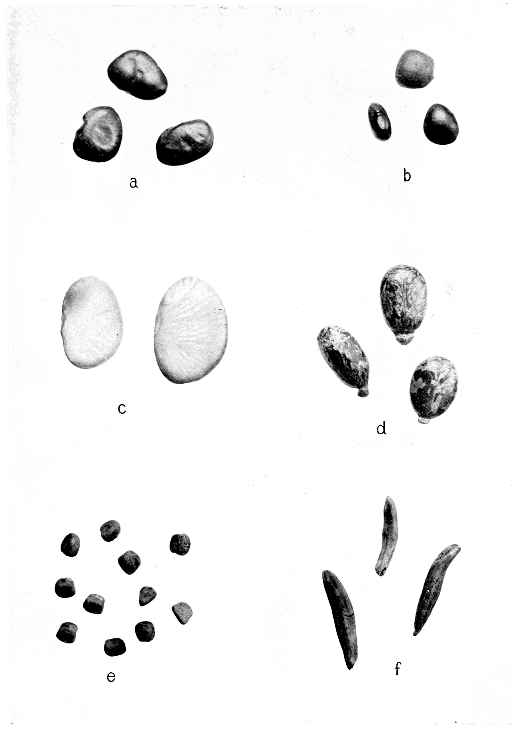 a Reddish-brown to reddish-purple “Java” Beans (Phaseolus lunatus); b “Red Rangoon” Beans (P. lunatus); c “Large White” Beans (P. lunatus); d Castor Oil Beans (Ricinus communis); e “Indian Peas” (Lathyrus sativus), from Bombay; f Ergot (Claviceps purpurea), from Spain. All natural size.