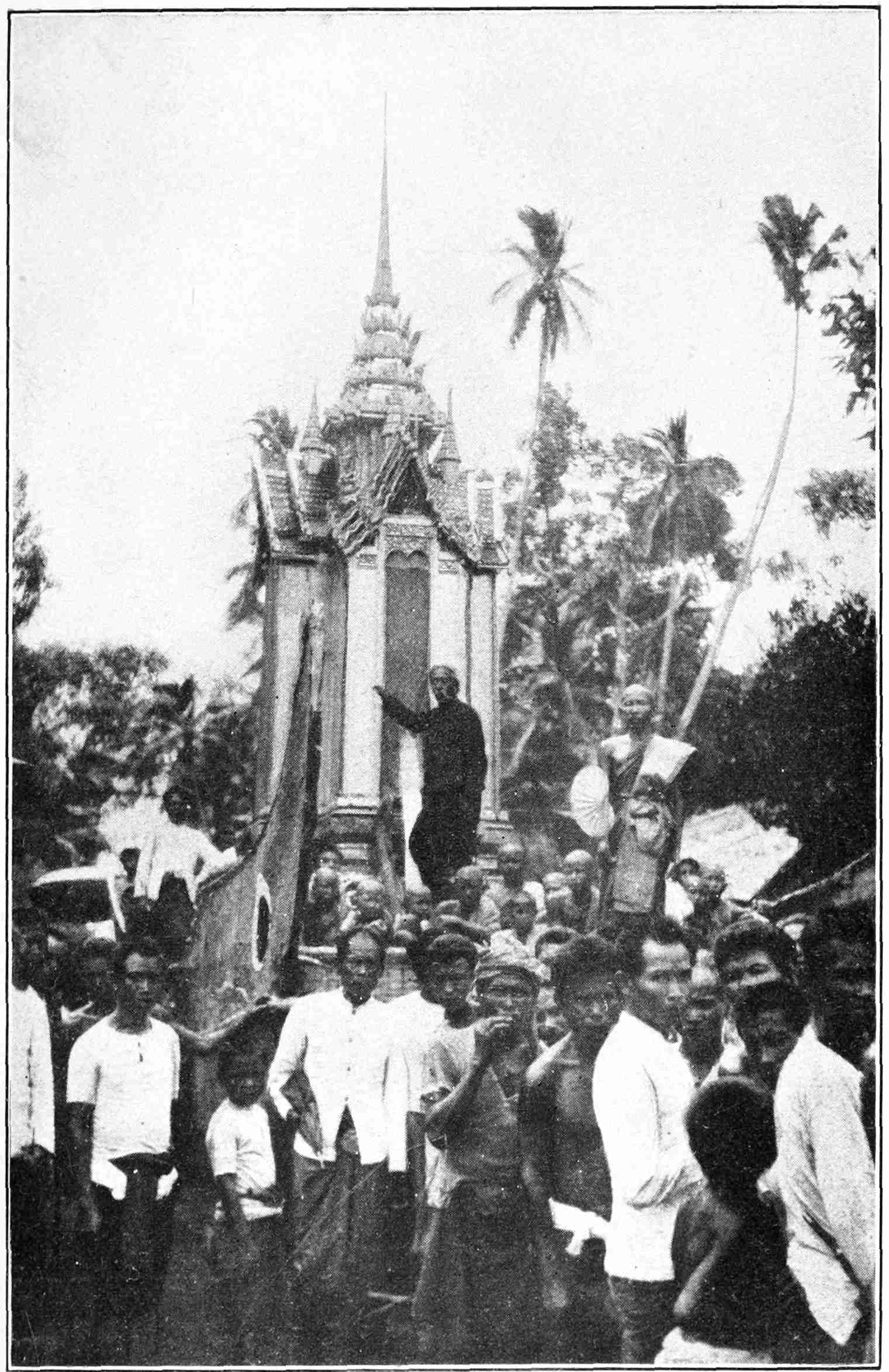 Not only the missionaries but the Lāo people loved him as a friend and venerated him as a father. Some of his intimate friends were the abbots and monks of the Buddhist monasteries and the high officials of the country. No one could know him without recognizing the nobility of soul of this saintly patriarch, in whom was no guile. December 6th, 1910, many Americans and Europeans celebrated the fiftieth anniversary of his marriage. The King of Siam through Prince Damrong, Minister of the Interior, sent a congratulatory message. Letters, telegrams, and gifts poured in from many different places. The Christian people of the city presented a large silver tray, on which was engraved: “The Christian people of Chiengmai to Dr. and Mrs. McGilvary, in memory of your having brought the Gospel of Jesus Christ to us forty-three years ago.” The tray showed in relief the old rest-house where Dr. and Mrs. McGilvary spent their first two years in Chiengmai, the residence which was later their home of many years, the old dilapidated bridge, and the handsome new bridge which spans the river opposite the Christian Girls’ School—thus symbolizing the old and the new eras.