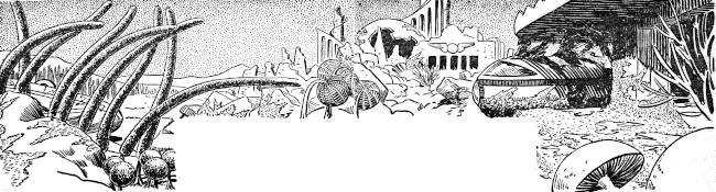 Kimball Trent fired five times, bracing himself against the concussions, blowing away the center of the cliff that towered twenty feet above the Gharrian's head. And on the fifth shot, even as the monster from outer space began to move with sudden speed for safety, the embankment collapsed, burying him beneath tons of earth.