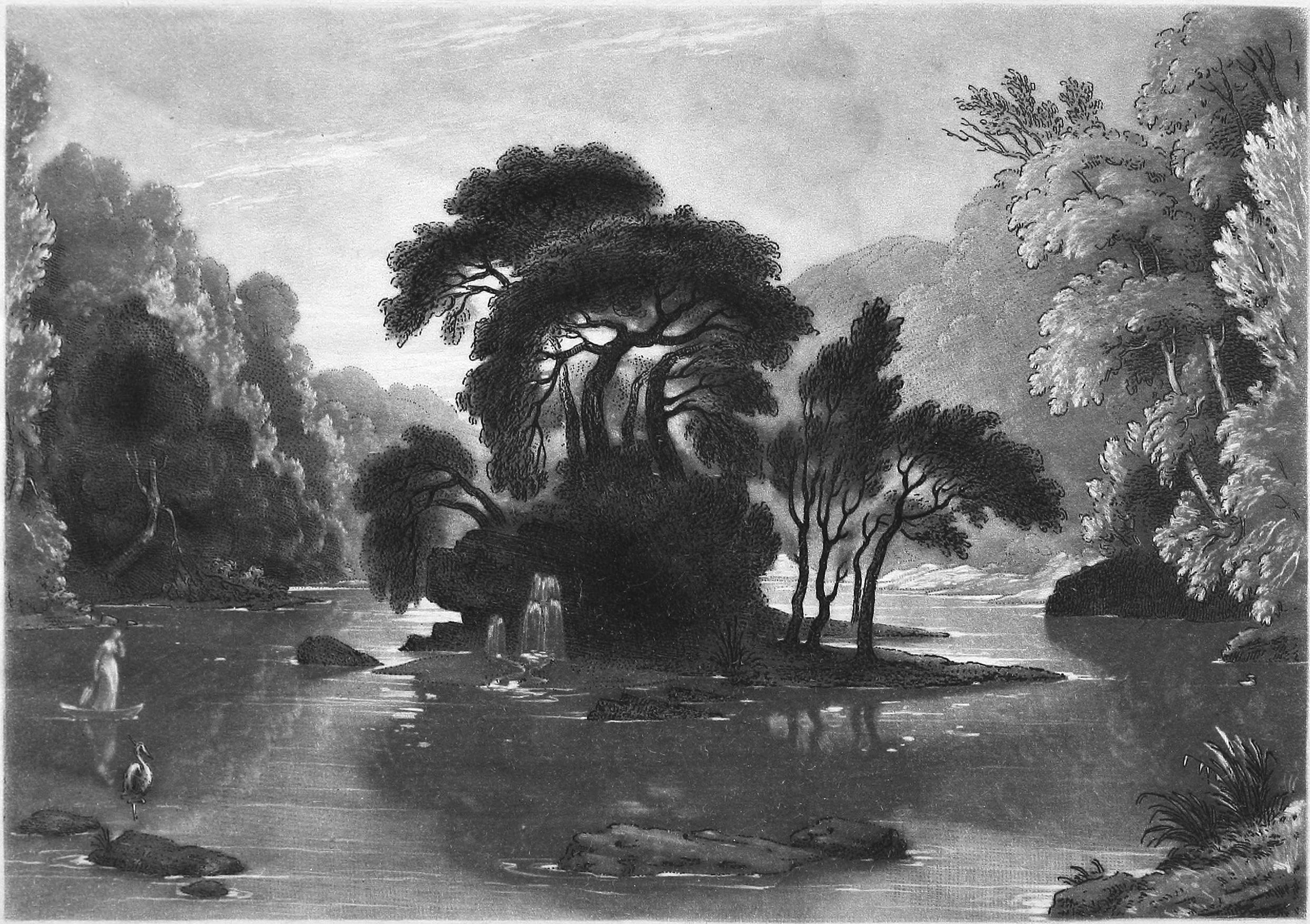 It was during one of my lonely journeyings, amid a far-distant region of mountain locked within mountain, and sad rivers and melancholy tarns writhing or sleeping within all—that I chanced upon the rivulet and the island which are the subject of our engraving. I came upon them suddenly in the leafy June, and threw myself upon the turf, beneath the branches of an unknown odorous shrub, that I might doze as I contemplated the scene. I felt that thus only should I look upon it, such was the character of phantasm which it wore.