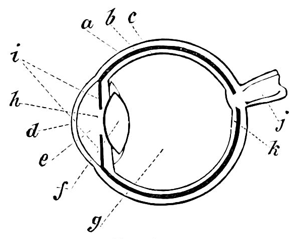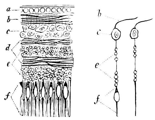 With perhaps the exception of the ear, the eye is the most wonderful example of the infinite skill of the Creator. A more exquisite piece of mechanism it is impossible for the human mind to conceive. The annexed diagram (Fig. 1) of a horizontal section of this organ will give a better idea of its general structure than whole pages of letter-press. It will be seen to consist of a globe of three envelopes or coats, which are kept distended by three transparent humours or lenses: the aqueous (e), the crystalline (f), and the vitreous (g). The outer coat (a) is dense, white, and fibrous. In front of the eye it gives place to a perfectly transparent one, called the cornea (d). The next coat, the choroid (b), is vascular, very black on its internal surface, in order that light falling on it through the pupil (h) may not be reflected. The pupil is an opening through a diaphragm which is called the iris (i), from its colour varying in different individuals. It has the power of expanding and contracting the pupil, for the purpose of regulating the supply of light to the retina (c), or third and last coat which lies immediately on the choroid. It is transparent, very complex, and the only part of the eye we shall carefully consider. The following diagram (Fig. 2) represents a section of it magnified 250 diameters, a is called the limitary membrane, and forms its innermost surface, or that which is next the vitreous humour; b consists of the layer of optic nerve fibers; c is a layer of grey nerve cells; d, two layers in which the principal retinal blood-vessels are spread out; e, two layers of granular matter; f, Jacob’s membrane, or layer of rods and cones. Fig. 3 will give some idea of the supposed connexion between these various parts, the same letters referring to the same parts as in Fig. 2.