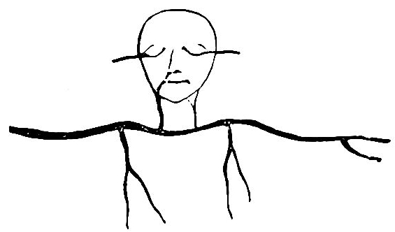 After this rapid glance at so complicated a structure, and bearing in mind that some persons can see its several parts with vastly greater facility than others, it cannot be a matter of surprise that individuals not aware of these facts are, now and then—especially at night, and when carrying a light about—startled by what they fancy an apparition, but which is in reality nothing more than some part of the structures above considered. A lady assures us that she saw the ghost of her husband as she was going downstairs with a lighted candle in her hand. The spot k, Fig. 4, when seen against a wall a few feet distant, appears about the size of a human head, and wants very little to furnish it with features. Figured paper on the wall, and a host of other things, may supply them, or even the retinal artery, which often lends body and limbs. (Fig. 5.)
