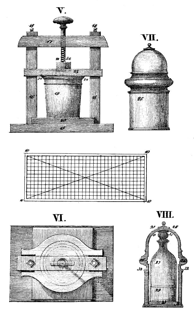 42. L'Acido acetico poliaromatico; Acetum prophylaticum; Aceto antisettico, Aceto dei 4 Ladri, si prepara prendendo le piante recenti di assenzio, di menta crespa, di ruta, di rosmarino, un'oncia e mezza per sorte; fiori secchi di lavanda, due once; di radice di calamo aromatico, di corteccia di cinamomo, di noce moscada, di garofani, di ciascuno due dramme. Il tutto ben diviso e mescolato insieme si fa macerare in dieci libbre d'ottimo aceto, posto in una cucurbita di vetro, chiusa per dodici giorni: poi si preme e si feltra; indi aggiungasi un'oncia d'alcool canforato, e si serba in un recipiente di vetro chiuso.