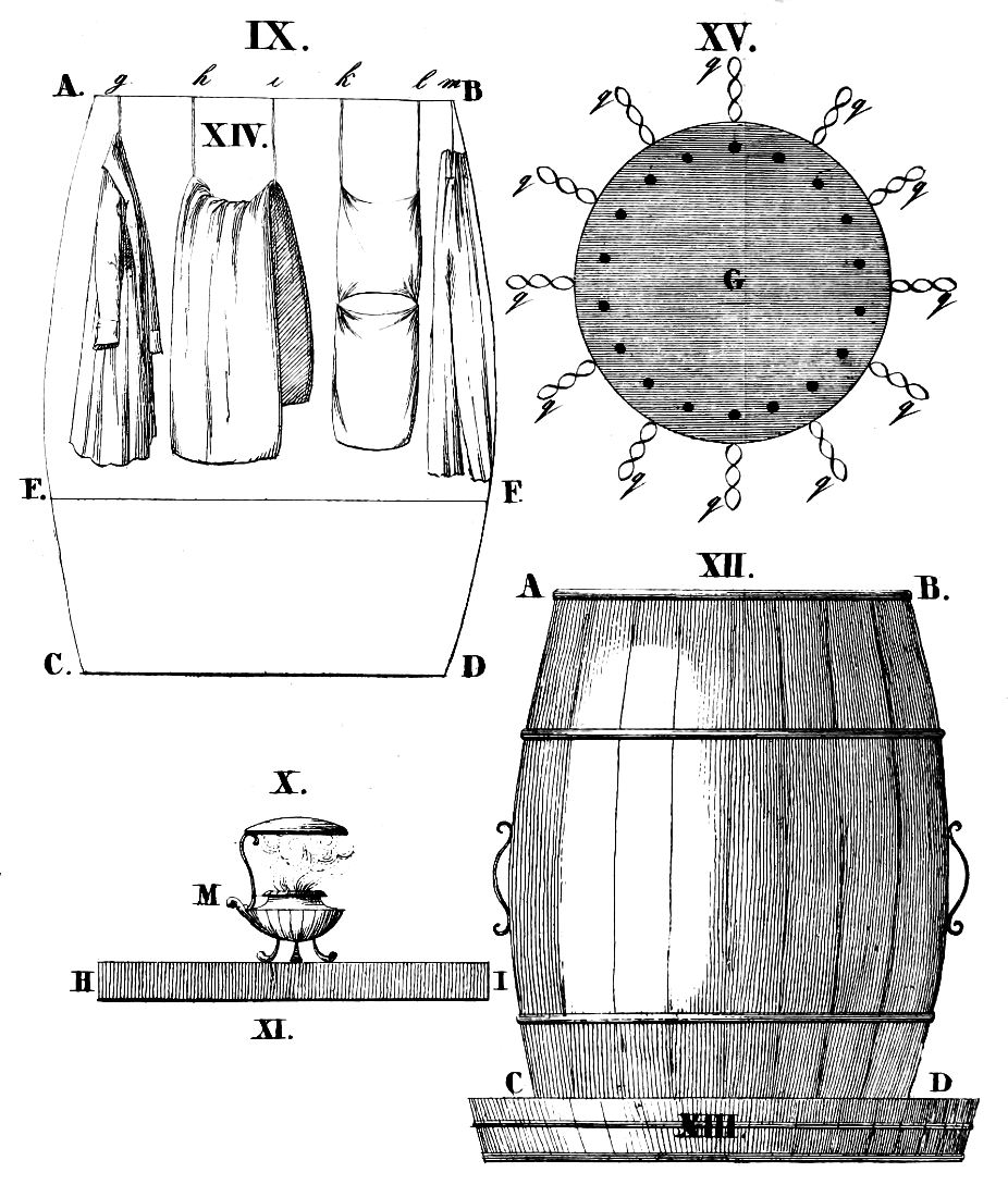 Per le robe non infettate, ma sospette, basterà aprir le casse, le credenze, gli armadj, le scattole, gli scrigni, ec. Le robe preziose si potran coprire con qualche tovaglia, o tela grossa, affinchè non ricevano in se la parte più grossa e terrea del fumo. Le vesti, ove sia argento, e così i vasi d'argento, patiscono notabilmente, come ancora le pitture; quindi si può usar per esse qualche leggier profumo in camera aperta, oppure esporle all'aria, e al sole per 15 dì». (P. Maur. da Tol. op. cit.).