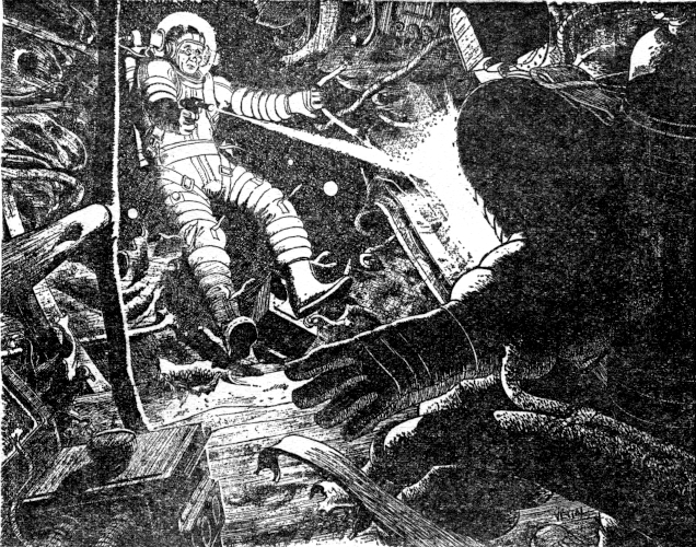 Presently they stood again on the outer hull, under an unreal canopy of stars. Nearby, a ghastly satellite was swinging inward toward the ship. Pop stared at it and back to Carnavon. He began to understand what the wrecker planned. He was going to leave him here—on the wreck. And he would die here. He understood that the shot that remained in the blaster wasn't for him after all. Carnavon wasn't going to waste it on him. There was a spanner in the wrecker's hand and he now advanced purposefully toward Pop Wills.