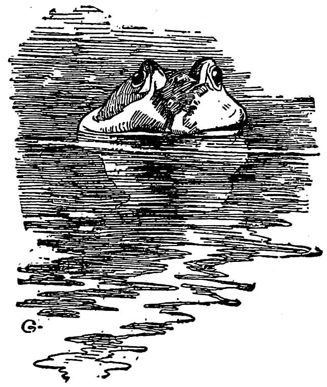 “Gracious,” she said, “how that scared me. I do believe it was that big green and brown frog. See him down there, Belinda? He is just showing his head and his funny eyes out of the water. Let’s get down close to him, and maybe he’ll come out all the way.”