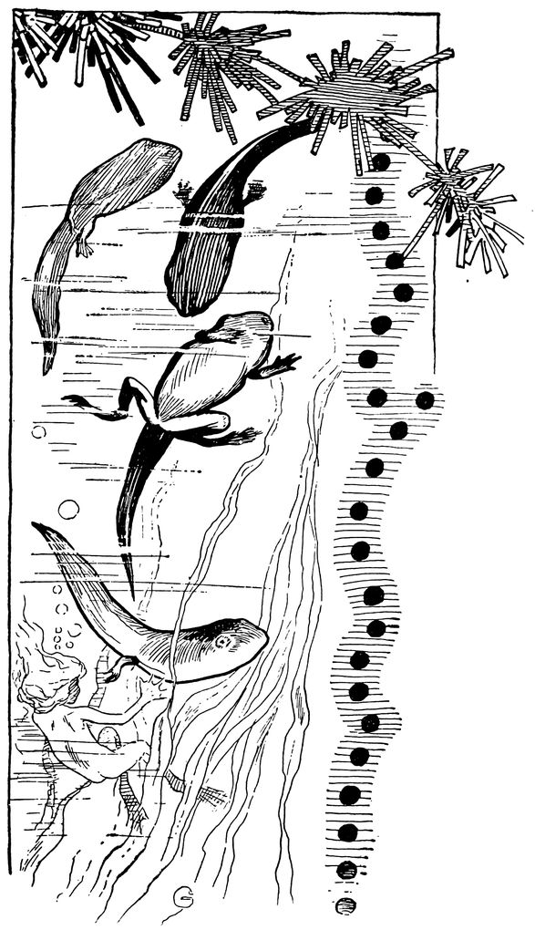 “I didn’t move, but my tongue did, and it went so quick you couldn’t see it. When you eat, you bring things to your tongue, but when I eat, I send my tongue to my dinner. It’s a simpler way, I think. My tongue is rather wonderful too. It is fastened 20to my mouth in front, and rolled back; besides, it has a sort of glue on the end that catches whatever there is to catch. The number of pests I eat in a day would astonish you. Slugs, grubs, snails, mosquitoes, and—well, what’s the matter? You don’t like such things, I suppose. Tastes differ, you see. Now, to tell my story. What do you think I looked like when I was first hatched?”