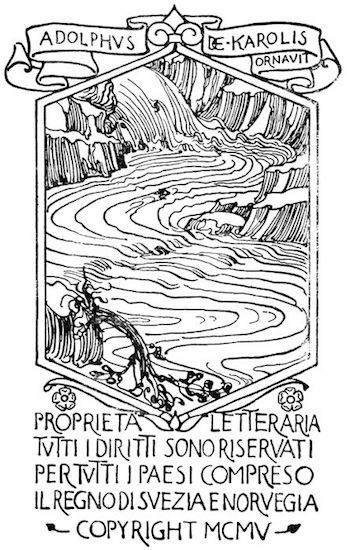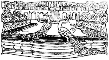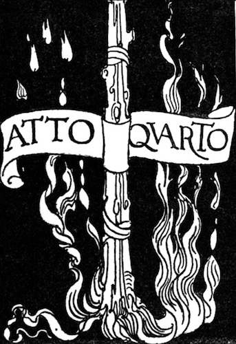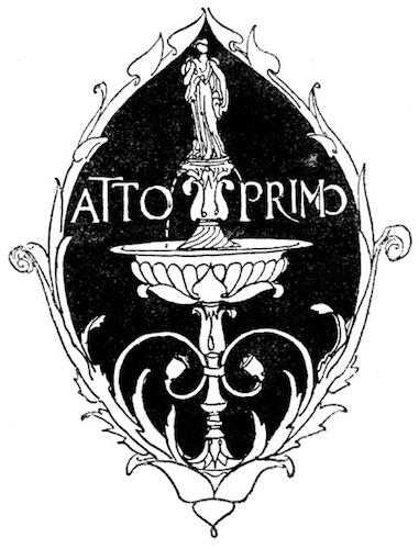 Appare un'aula vastissima nella casa antica dei Sangro costrutta sul dosso ineguale del monte. Alla robustezza della primitiva ossatura normanna tutte le età han sovrapposto le loro testimonianze di pietra e di cotto, dal regno degli Angioini al regno dei Borboni. Ricorre all'intorno un ballatoio ricco di sculture, sopra arcate profonde; delle quali alcune sono tuttora aperte, altre sono richiuse, altre sono rette da puntelli. Delle tre in prospetto, la mediana prolunga la sua vôlta verso il giardino che splende, di là da un cancello di ferro, con i suoi cipressi le sue statue i suoi vivai; la destra mette a una scala che ascende e si perde nell'ombra; la sinistra, ornata in ciascun fianco da un mausoleo, s'incurva su la porta della cappella gentilizia che a traverso i trafori di un rosone spande il chiarore delle sue lampade votive. A destra [8] gli archi, più leggeri, sorretti da pilastri isolati, si aprono su una loggetta del Rinascimento a cui fa capo un ramo della scala che discende nella corte. A sinistra, nel muramento d'un arco è praticata una piccola porta; e quivi presso, armadii e scaffali son carichi di rotoli e di filze. Cumuli di vecchie pergamene ingombrano anche il pavimento sconnesso, sopraccàricano una tavola massiccia intorno a cui son seggioloni e scranne. Busti illustri su alte mensole, grandi torcieri di ferro battuto, cassapanche scolpite, una portantina dipinta, alcuni frammenti marmorei compiscono la suppellèttile. Una fontana di gentile lavoro, dominata da una statuetta muliebre, alza nel mezzo dell'aula la sua conca vacua. E il tutto è vetusto, consunto, corroso, fenduto, coperto di polvere, condannato a perire.