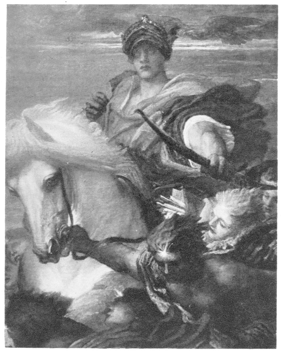 Similar lines of comparison, so far as they appear to possess any value, could, of course, be very easily pointed out in connexion with the character of{62} Watts’ draughtsmanship. That his lines are simple and powerful, that both in strength and weakness they are candid and austere, that they are not Celtic, not Catholic, and not romantic lines of draughtsmanship, would, I think, appear sufficiently clear to anyone who has any instinct for this mode of judgment at all. In the matter of line and composition, of course, the same general contention applies as in the case of colour. The curve of the bent figure of Hope, considered simply as a curve, half repeating as it does the upper curve of the globe, suggests a feeling, a sense of fear, of simplicity, of something which lies near to the nature of the idea itself, the idea which inspires the title of the picture. The splendid rushing whirlpool of curves which constitutes, as it were, the ellipse of the two figures in Diana and Endymion is a positive inspiration. It is, simply as a form for a picture, a mere scheme of lines, the very soul of Greece. It is simple; it is full and free; it follows great laws of harmony, but it follows them swiftly and at will; it is headlong, and yet at rest, like the solid arch of a waterfall. It is a rushing and passionate meeting of two superb human figures; and it is almost a mathematical harmony. Technically, at least, and as a matter of outlines, it is probably the artist’s masterpiece.