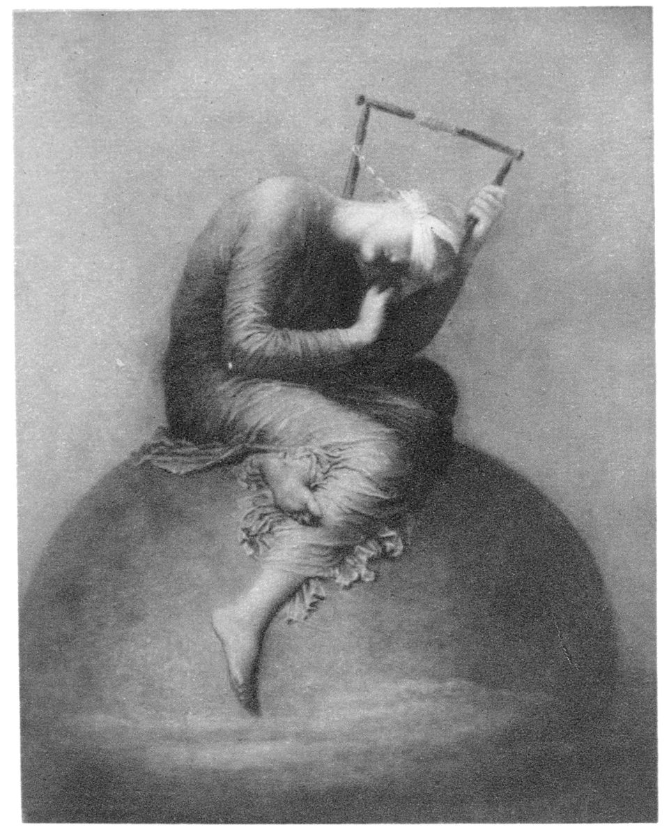 I need not instance the admirable and innumerable cases of this fine and individual effect. Eve Repentant (that fine picture), in which the agony of a gigantic womanhood is conveyed as it could not be conveyed by any power of visage, in the powerful contortion of the muscular and yet beautiful back, is the first that occurs to the mind. The sad and sardonic picture painted in later years, For He had Great Possessions—showing the young man of the Gospel loaded with his intolerable pomp of garments and his head sunken out of sight—is of course another. Others are slighter instances, like Good Luck to your Fishing. He has again carried the principle, in one instance, to an extreme seldom adopted, I should fancy, either by artist or man. He has painted a very graceful portrait of his wife, in which that lady’s face is entirely{64} omitted, the head being abruptly turned away. But it is indeed idle to multiply these instances of the painter’s hobby (if one may use the phrase) of the worship of the human back, when all such instances have been dwarfed and overshadowed by the one famous and tremendous instance that everyone knows. Love and Death is truly a great achievement: if it stood alone it would have made a man great. And it fits in with a peculiar importance with the general view I am suggesting of the Watts technique. For the whole picture really hangs, both technically and morally, upon one single line, a line that could be drawn across a blank canvas, the spine-line of the central figure of Death with its great falling garment. The whole composition, the whole conception, and, I was going to say, the whole moral of the picture, could be deduced from that single line. The moral of the picture (if moral were the right phrase for these things) is, it is scarcely necessary to point out, the monument of about as noble a silence and suppression as the human mind ever bent itself to in its pride. It is the great masterpiece of agnosticism. In that picture agnosticism—not the cheap and querulous incredulity which abuses the phrase, but loyal and consistent agnosticism, which is as willing to believe good as evil and to harbour faith as doubt—has here its great and pathetic place and symbol in the house of the arts. It is the artistic embodiment of reverent ignorance at its highest, fully as much as the Divine Comedy is the artistic embodiment of Christianity.