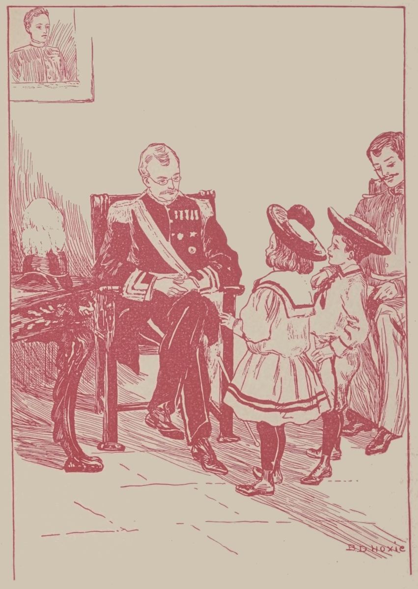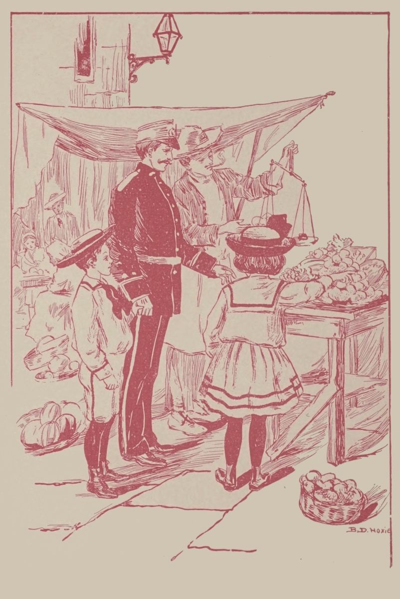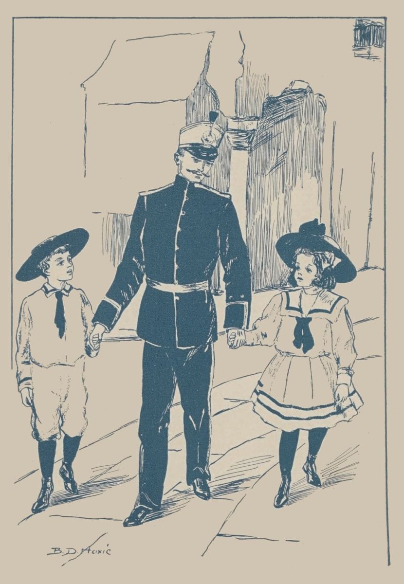 They made a pretty picture as they went down the narrow street, stopping once to wave their hands to the dark-eyed young mother who watched them from behind the barred windows of their quaint old house. More than one passer-by glanced after them half-enviously, for the erect young military{6} man with his little son and daughter on either side was good to look upon, and their merry laughter was contagious.