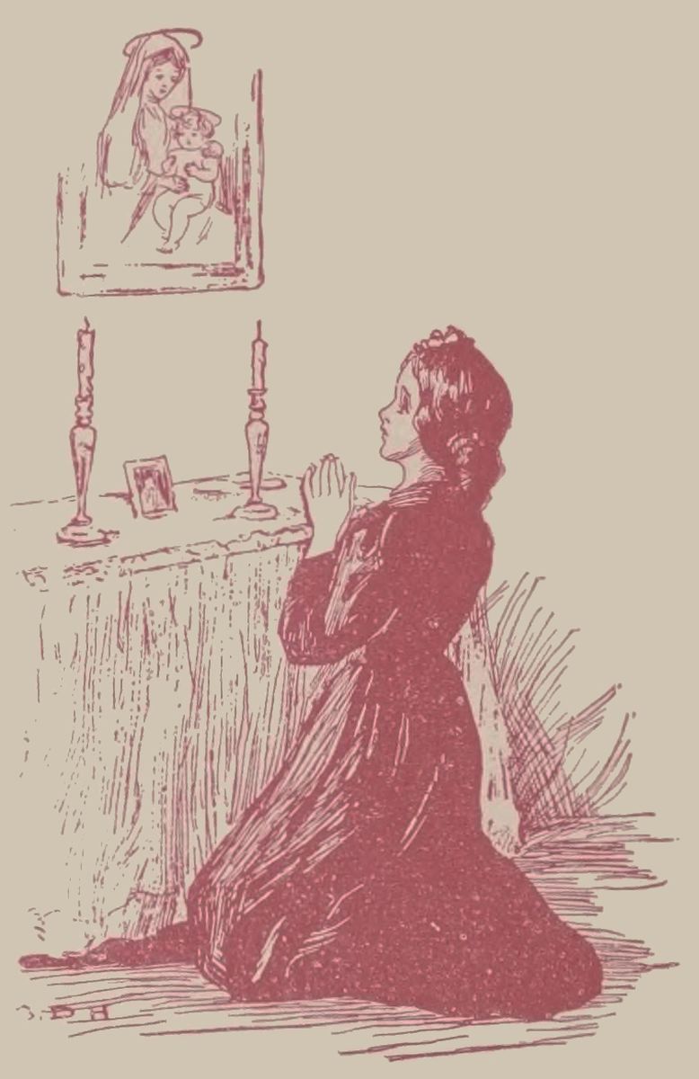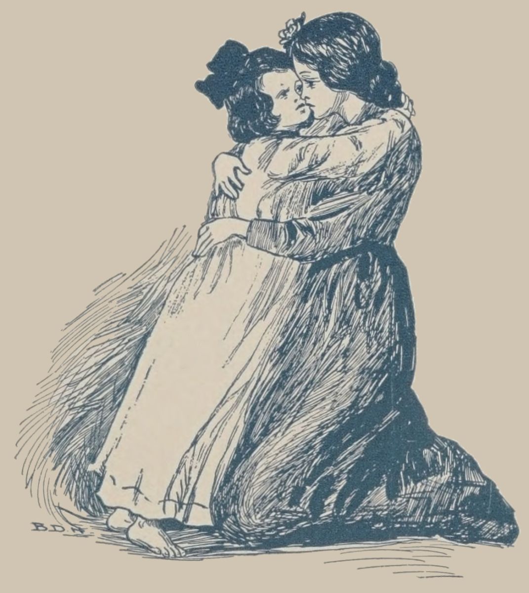 The little girl remembered everything at once—the stories that Dolores had told her and the sadness of Mariquita’s heart. Then she forgot all else in her longing to comfort the sweet girl, who had been so kind to her. She slipped softly out of bed and, running noiselessly across the floor, put her arms around Mariquita’s neck. At the gentle embrace, the girl looked up half-startled, almost believing that the old legend had come true and that the Virgin had really come. But Anitia kissed her before she could speak.