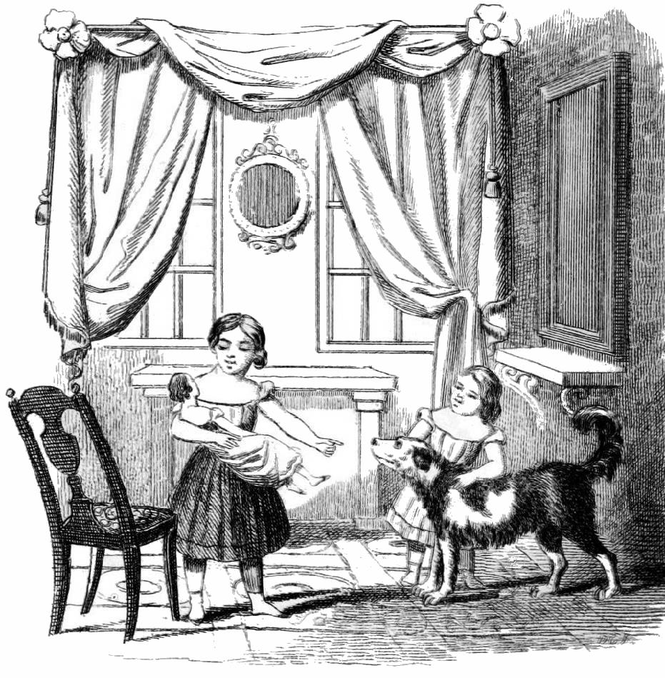 My new mother's name was Violet La Grange, and she was very much pleased with me, and showed me all round the house. Every one else seemed pleased with me too, especially Lily, her younger sister, who patted the dog, and called him a "real good dog," and many other names. The place where I now live is called "La Grange Place," and is a most beautiful mansion-house, with parks, and everything else befitting such a splendid place. My new mother made me dresses, and got me a little house, in which I can live. I think I never shall have any other mamma, for she told her little sister that she should[Pg 82] have me when she is herself too old to play with me. I have formed an acquaintance with another doll, who lives a little way from here. Her name is "Maria Poppet," and her mother is Lucy Ashbourne, the most intimate friend of my mother. For Maria I entertain a most lively friendship, and when our mammas are playing round, we relate to each other our adventures. Maria's adventures you may read in a volume entitled "The London Doll."