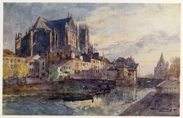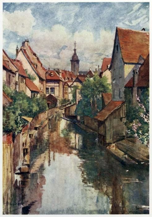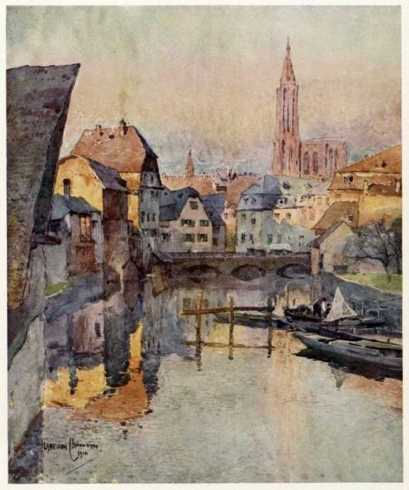 N'importe : un coin tourné tout cela cesse d'exister. Ici, c'est la vie fluviale, la “vieille France,” les “ponts couverts.” Là, au hasard des venelles étroites, toutes les merveilles des demeures vétustes aux pignons pointus, pittoresquement dentelés et découpés. A travers les toits immenses étrangement cabossés, expressifs comme d'anciens visages, les rangées des lucarnes veillent et clignent de l'œil. Ce sont, à profusion, des ornements de pierre et de bois, des balcons, des porches, des figurines, des balustres, tout le legs émouvant presque intact des artistes du moyen âge et de la Renaissance. Dans son tombeau de l'Église St. Thomas, Maurice de Saxe demeure endormi. Kléber étend toujours son geste héroïque sur la petite place ensoleillée en face des bonnes vieilles maisons bourgeoises assoupies. A l'angle d'une ruelle, la statue enluminée de l'Homme de fer monte la garde.