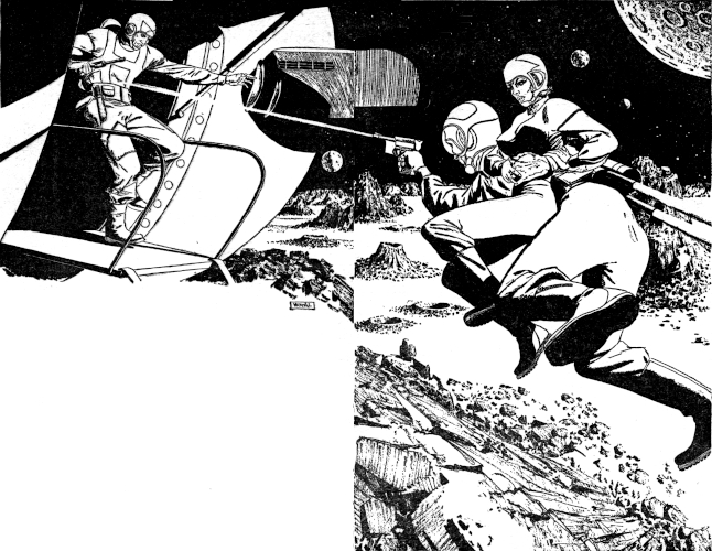 Without making any particular remarks about it, both of them had fastened a brace of guns to their jet-harnesses. At close range—held thirty feet away against the Asteroid's ring-bumpers by a set of dock grapnels—the Ra-Twelve's yawning lock looked more than ever like the black mouth of a cavern in which something was lurking for them.