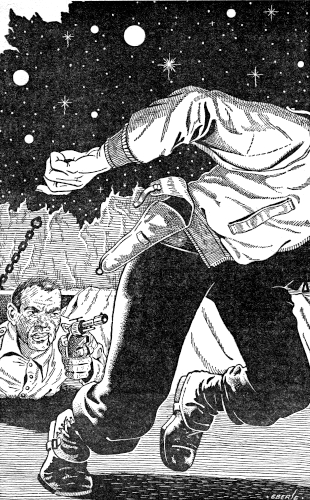 "That's right," the boy grinned. "Just that one thing, that section on Mars. Only now you aren't going to get it. You've got a one-track obsession, Hurtz, like a simple damned child, even though you've flown the universe for twenty years. This'll kill you, and you have my deepest regrets. Here," he said, sending the pistol spinning across the floor so that it stopped beside Hurtz's boots. "There's a round left in it. I saved it. Just for you."