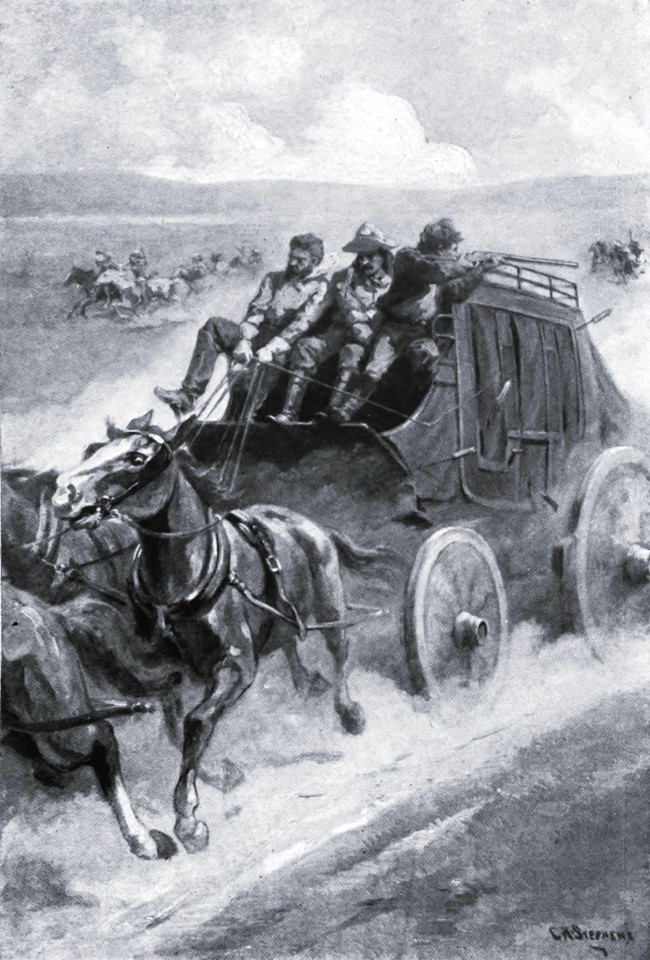 The whoops of the Indians were plainly heard; the breeze was from the south, and as if smelling the red enemy the stage horses were wild with fear. Braced, Waupsie sawed on the lines; his foot pressed the brake hard, but he might as well have saved his strength.