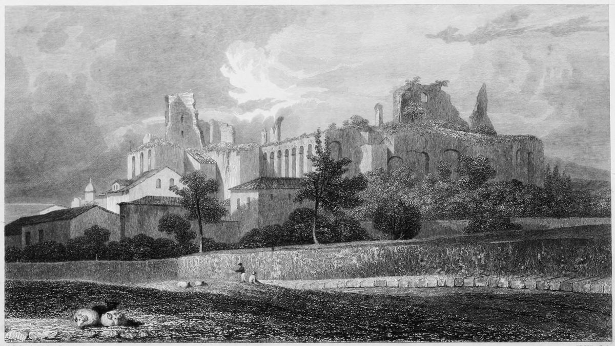 Proceeding from these baths to the extremity of the Via del Macao, we find in a vineyard, a mound of earth said to be part of the agger of Servius Tullius, and the range of arches stretching towards the gate of San Lorenzo, is part of the Marcian aqueduct, now carrying the Acqua Felice; but I shall reserve aqueducts and gates to a future letter, and pass on to the church of Santa Bibiena, where there are some ancient columns, and a statue of the saint by Bernini. It has been much admired, but like so many other works of this artist, fails in the want of apparent ease and simplicity of nature. By a gate which is not always open, we may pass into the inclosure containing the ruin, usually called the temple of Minerva Medica, rising in the midst of artichokes and brocoli. The principal remain is a large, domed, decagonal hall, a form not common in the Roman antiquities, with nine large niches, each occupying almost the whole of their respective sides, the tenth being the situation of the doorway; and a window over each. The dome is partly destroyed, and the remaining portion perforated in many places, shewing the ancient construction to have been formed by ribs tending to a centre, while the intervals are filled up with rubble. There are some remains of other rooms adjoining. The whole is overgrown with the lentiscus and other shrubs and plants. It forms a picturesque object, but it seems impossible to determine its primitive destination.