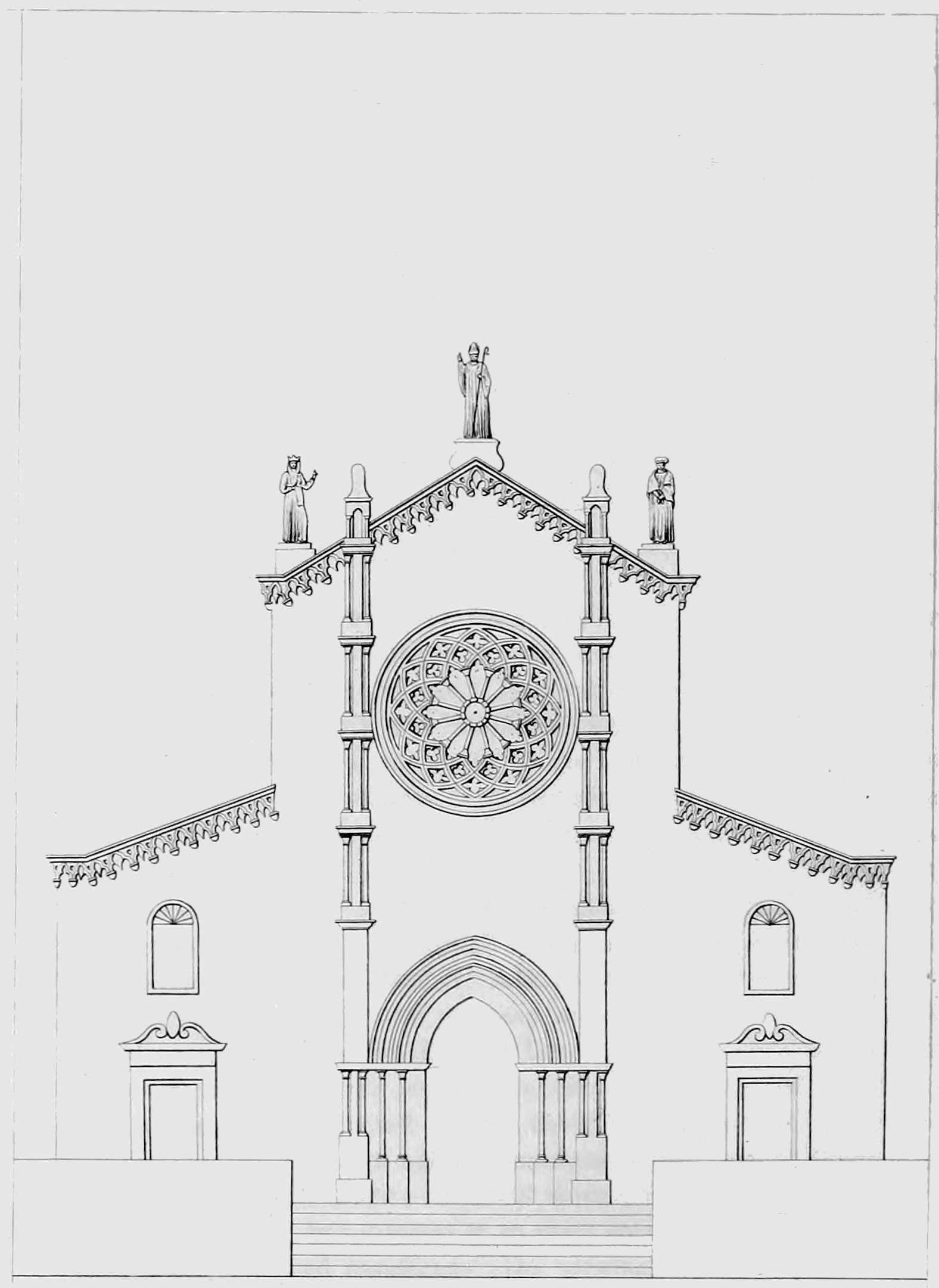 Genoa struck me at first view as presenting a long, and somewhat elevated horizontal line, advancing from the mountains to the sea; a fine 420composition, but completely different from what I had been taught to expect. The loftier mountains here recede considerably from the shore, but the interval is filled with high and steep hills, and the horizontal line was a very deceiving appearance, for of all cities I ever was in, it is the most uneven; and in most situations it takes the appearance usually ascribed to it of an amphitheatre rising from the sea. The palaces of Genoa are more celebrated than her churches, and in fact I shall have little to say concerning the latter. The Cathedral, dedicated to St. Lawrence, was built in the eleventh century, consecrated in 1118 by the pope Pelagius II., and restored in 1300. The front belongs to the latter date; the lower part is occupied by three pointed arches, with the little columns and other appendages of Gothic architecture. There is one marigold window in the centre, and several smaller ones. The intention was probably to erect two towers, but of these only one has been executed, and that at a later period, and it does not preserve the character of the rest of the building. There is not the least trace in this edifice of the taste which prevailed at Pisa and Lucca. Internally, the first arch is Gothic, and corresponds in style with the front; in the remaining part, small pointed arches rest on single columns. The latter are probably original parts of the building, and the arches above them, I suppose to have been originally semicircular.