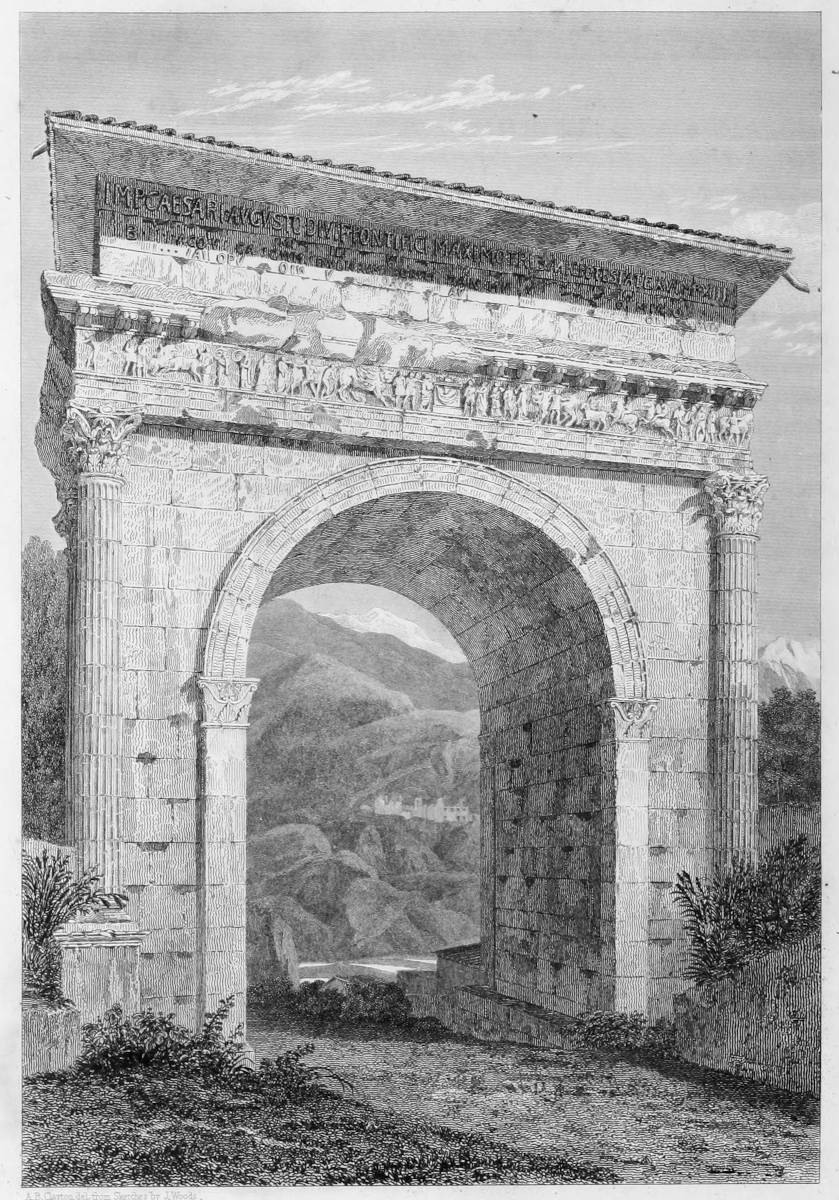 On the 18th of June I rode in a soaking rain from Turin to Susa, a city surrounded on three sides by snow-topped mountains. I spent some time at the Arch, which is a fine, but simple building of white marble. The upper part is destroyed, but enough of the Attic remains to exhibit the inscription. On the upper course, in a single line, are the following letters, which remain very perfect: Imp. Caesari Augusto divi f. pontifici maximo tribunic. potestate xx Imp. xiii.