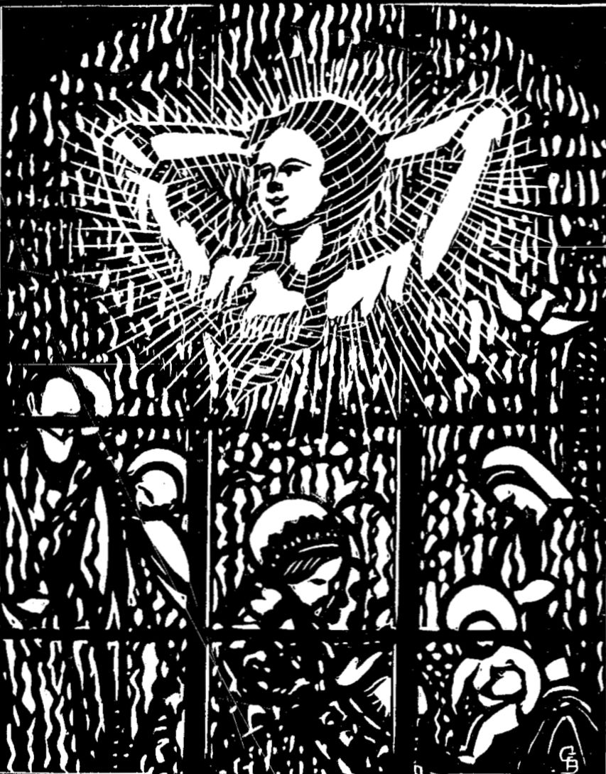 À ce moment, Luce, qui venait de baiser d'un regard passionné son cher petit compagnon,—(les yeux à demi clos et les lèvres entr'ouvertes, il paraissait perdu dans une extase de bonheur, et il levait la tête, par un élan de joie reconnaissante, vers cette Force suprême qu'on cherche instinctivement en haut)—Luce, avec saisissement, vit, dans le vitrail rouge et doré de la chapelle, la figure de l'enfant rousse du parvis qui souriait. Et comme elle restait muette, glacée d'étonnement, elle vit, de nouveau, sur l'étrange visage, la même expression d'effroi et de pitié.