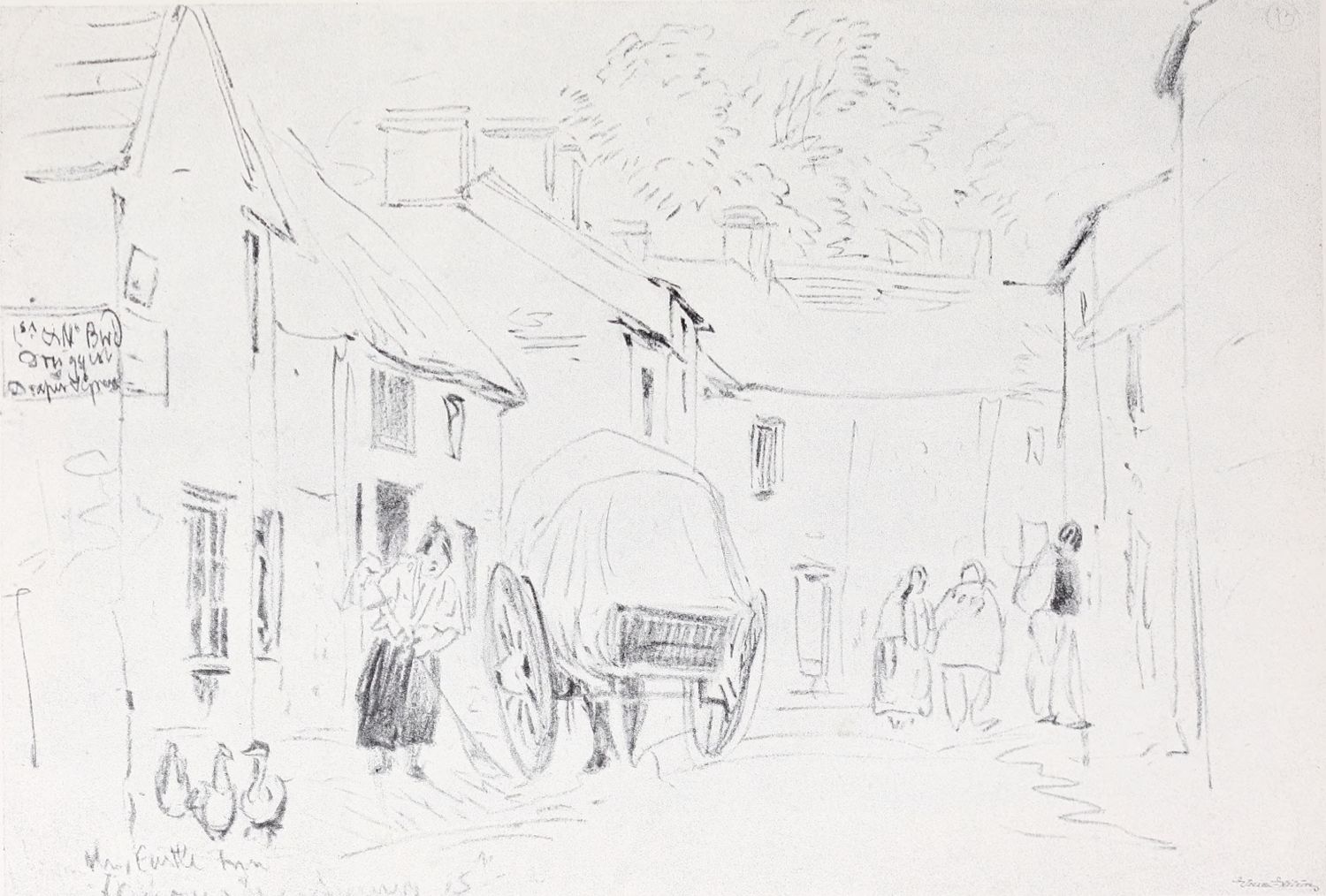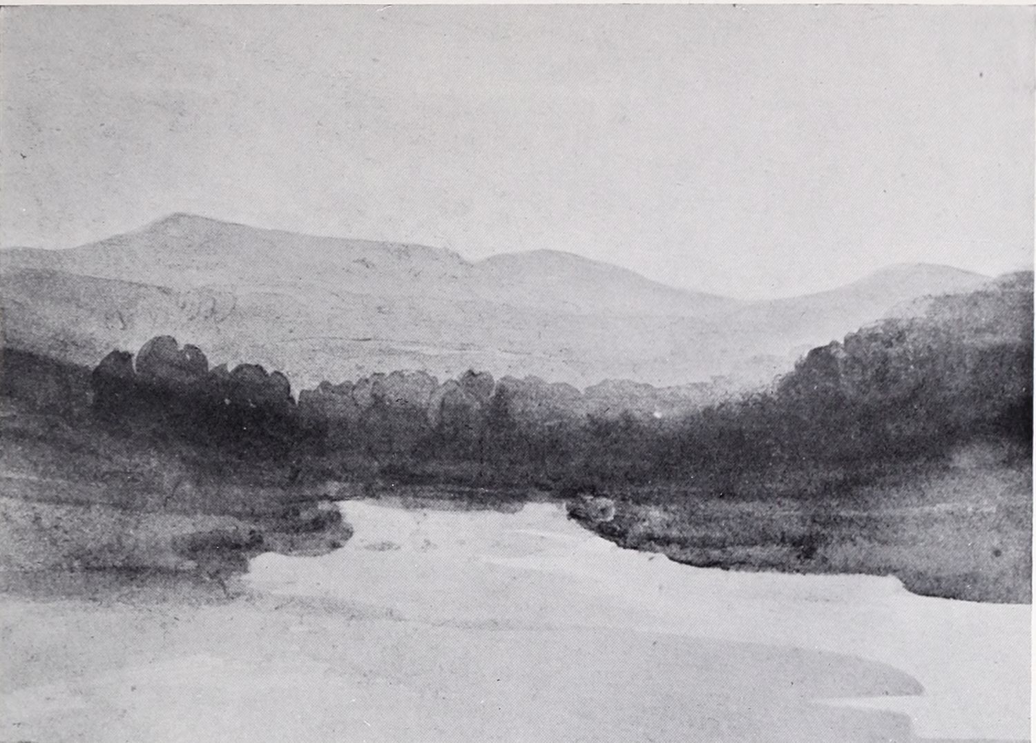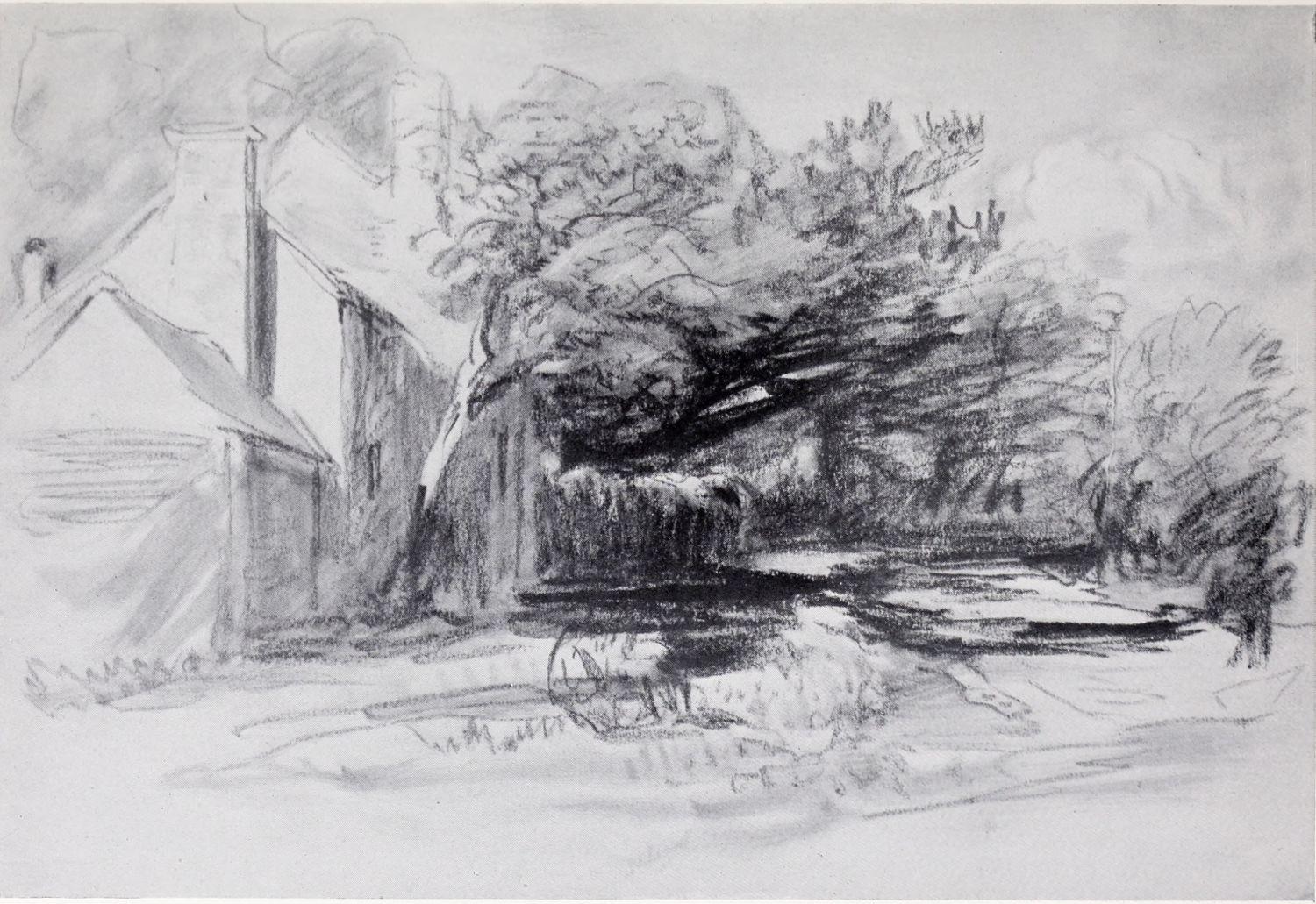 Even now, however, we have not come to the end of Cox’s multifarious activities during this period. Besides being an amateur agitator and gardener, a prolific artist in water colour, and an overworked teacher, he seems to have turned author as well. In 1814 he published an educational work on landscape art, called: “A Treatise on Landscape Painting and Effect in Water-Colours, from the first Rudiments to the finished Picture, with Examples in Outline Effect and Colouring.” This was illustrated by a number of soft-ground etchings. It was followed, in 1816, by “Progressive Lessons in Landscape for Young Beginners,” a series of twenty-four soft-ground etchings without letterpress; and in 1825, his “Young Artist’s Companion, or Drawing-Book of Studies,” appeared. It was perhaps as a preliminary study for one of the illustrations to these volumes that the pen and ink drawing reproduced in Plate XIV. was made. At any rate the interest of these publications depends rather upon the illustrations than upon the letterpress, many of the etchings containing the first ideas of subjects which later had great success as water-colours; the etchings of Changing Pasture and Going to the Mill, for example, furnished the subjects of some of Cox’s latest paintings. It has also been rumoured that Cox was not entirely responsible for the letterpress, being indebted for assistance in its composition to some unknown “clergyman.” However this may be, it is pretty certain that the opinions must have been those which Cox himself held. And as the opinions of a great artist as to the aim and scope of his own art are always of interest it may be{14} advisable to quote a passage or two from these books, even though some other hand may have corrected the artist’s grammar and inflated his periods.