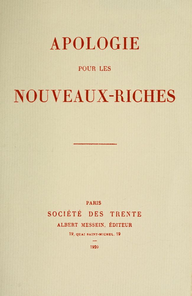 Le Nouveau-riche est à peu près le seul homme de France à qui la guerre ait été de quelque profit. Ce profit, il est vrai, fut grand.
