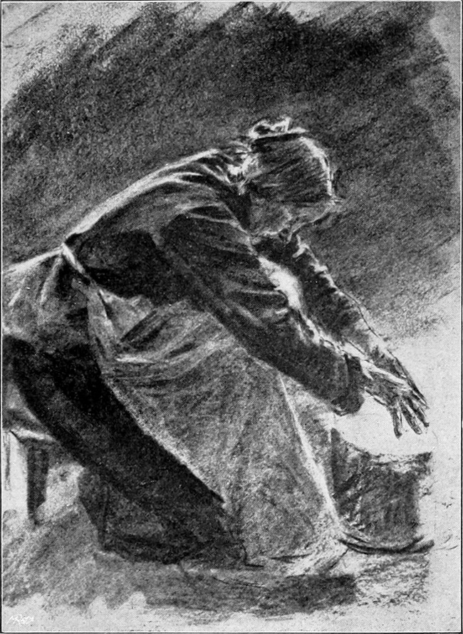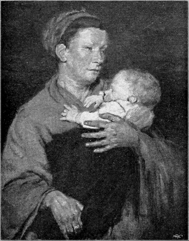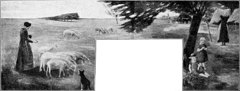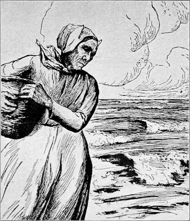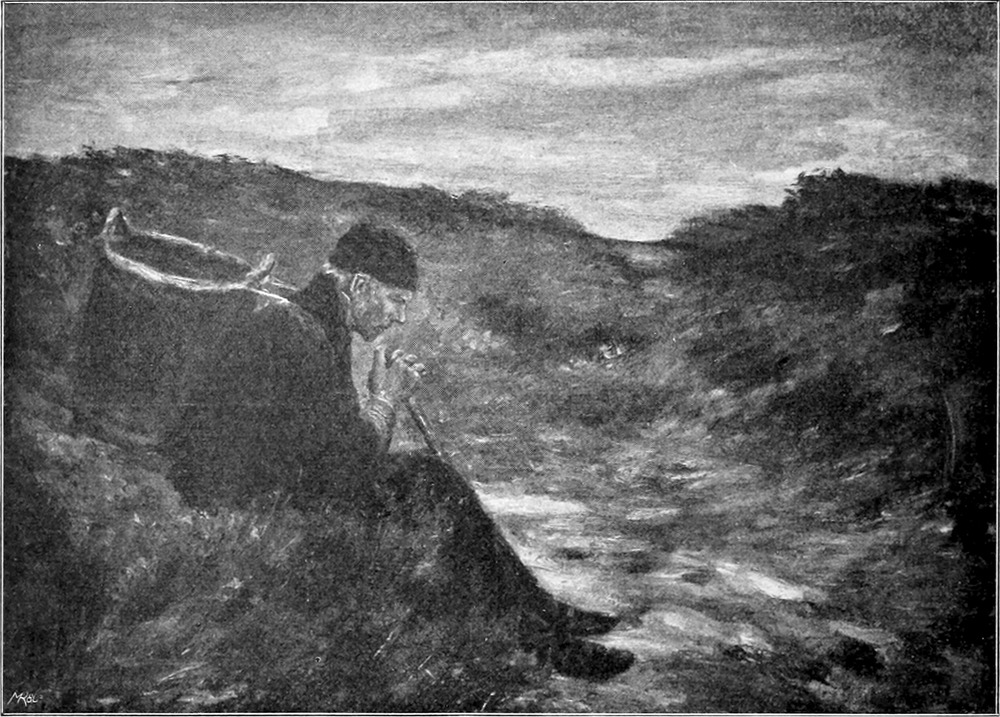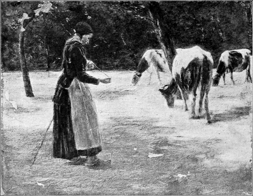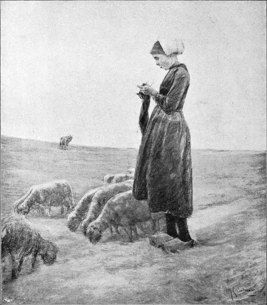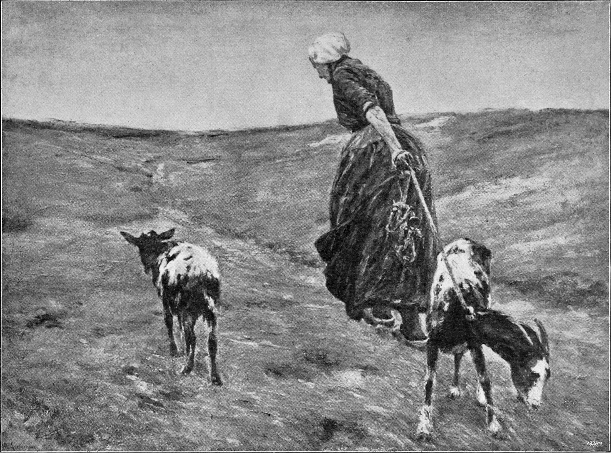 Unter den Schöpfungen der folgenden Jahre erscheint noch einmal ein Werk von fast gleich starker Wirkung: „Die Frau mit den Ziegen“ (Abb. 52), die der Münchener Pinakothek gehört. Auch hier wieder die unlösbare Zusammengehörigkeit von Mensch und Scholle und wieder eine ungemein[S. 40] charaktervolle Erscheinung, deren kräftige Silhouette gegen die graugrüne Düne und den trostlos grauen Himmel man, einmal gesehen, ebensowenig vergißt, wie die kühne jener blonden Fischerstochter. Wie eine Personifikation der weltentrückten Einsamkeit zieht die Alte mit ihren beiden Ziegen über die sandige Düne.