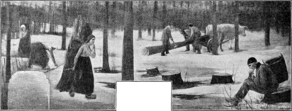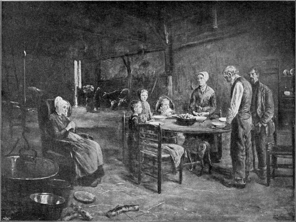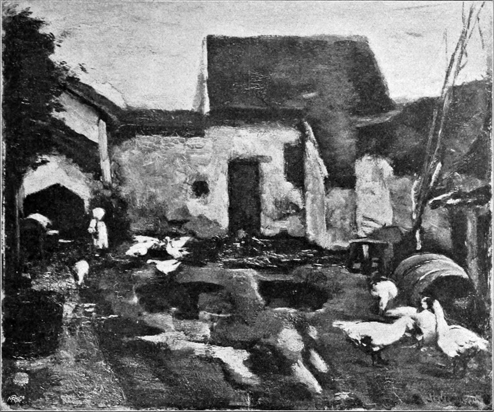 Es liegt eine gewisse Ungerechtigkeit darin, Liebermann immer als den Nachfolger, wenn nicht gar Nachahmer Millets hinzustellen, auch hinsichtlich seines Stoffgebietes. Wenn er nicht über Millet hinausgekommen wäre, so würde man ebensowenig von ihm sprechen, wie man von Fritz Werner spricht, der sich bemühte, die Wege Menzels[S. 62] zu gehen. Man unterschätzt Liebermanns künstlerische Gesinnung und die neue Schönheit, die er in die Kunst gebracht hat, wenn man ihren Ursprung außer ihm sucht und zu finden meint. Niemand wird leugnen, daß er derjenige war, der in Deutschland den Blick auf die Wandlungen gelenkt hat, die in der französischen Kunst seit 1860 vor sich gegangen waren, und so gleichsam ein Apostel neuer künstlerischer Lehren geworden ist; wäre aber nicht zugleich ein starker Strom persönlicher künstlerischer Macht von ihm ausgegangen, so würde man sich in Deutschland vielleicht heute noch nicht viel um Millet und seine künstlerischen Grundsätze bekümmern. Millet hat Barbizon entdeckt, mit seinen stillen, wehmütigen Bauern, die, als verrichteten sie feierliche Handlungen, das Feld bestellen, Bäume fällen, Strümpfe stricken und Ähren sammeln. Liebermann zog für die Mitwelt den Schleier fort, hinter dem eine vergessene Welt lag, voll Eigenart und Schönheit; er that die Thüren auf zu den Schatzkammern, aus denen die feinsten Maler des siebzehnten Jahrhunderts geschöpft, er fand Holland wieder, das malerischste Land der Welt. Die Rousseau, Troyon, Daubigny, Dupré, die Ehrwürdigen von Fontainebleau hatten die Prinzipien der holländischen Landschafter des siebzehnten Jahrhunderts für die Gegenwart lebendig gemacht. Liebermann ging zu den Quellen. Er hatte den Mut, sich nicht darum zu kümmern, was und wo die anderen gemalt; er sah selbst zu, was es zu malen gab. Diese Selbständigkeit im Ermitteln von malerischen Motiven kündigt sich freilich in seinem ersten Bilde, den „Gänserupferinnen“, noch nicht an. Die Idee zu solchen Bildern lag in der Luft. Paul Meyerheim hatte 1871 eine „Schafschur“ gemalt. Es sei ferner an Hirth du Frênes’ „Hopfenernte“ erinnert, auf der sich sogar auch der dem Ostade, Jan Steen oder irgend einem anderen der holländischen Sittenmaler abgesehene Lichteffekt mit dem Fenster im Hintergrunde und den darunter in schummeriger Beleuchtung stehenden Personen vorfindet. Nur daß Rudolf Hirth noch nicht so völlig darauf verzichtet hatte, dem Publikum etwas zu erzählen und inmitten der in ihre Arbeit vertieften Weiber[S. 63] ein Liebespaar setzt. Auch Liebermanns erste „Konservenmacherinnen“ — die Abb. 3 gibt die zweite Wiederholung; das im Leipziger Museum befindliche 1878 gemalte Bild hat damit weder in Farbe noch Komposition Ähnlichkeit — zeigen noch keine veränderte künstlerische Anschauung. Das Licht- und Schattenspiel rechts im Hintergrunde ist beibehalten. Aber schon in den „Invaliden“ von 1874 kündigt sich die Gabe Liebermanns, eigenartige neue Motive aus der Wirklichkeit herauszusehen, an, und auch die künstlerische Idee gelangt fester und stärker zum Ausdruck. War auf den ersten Bildern die Lichtquelle im Hintergrunde nur Episode, um dessen nächtliche Schwärze aufzulichten, so ist sie hier eben schon hauptsächliche künstlerische Idee, mit Verständnis, aber noch nicht eigentlich in einem neuen Sinne durchgeführt. Auch der „Bauernhof“ von 1875 (Abb. 6) zeigt ein damals noch ungewöhnliches Motiv, zugleich aber schon ein bemerkenswert sicheres Gefühl für die Verteilung der hellen und dunklen Flecken im Bilde.