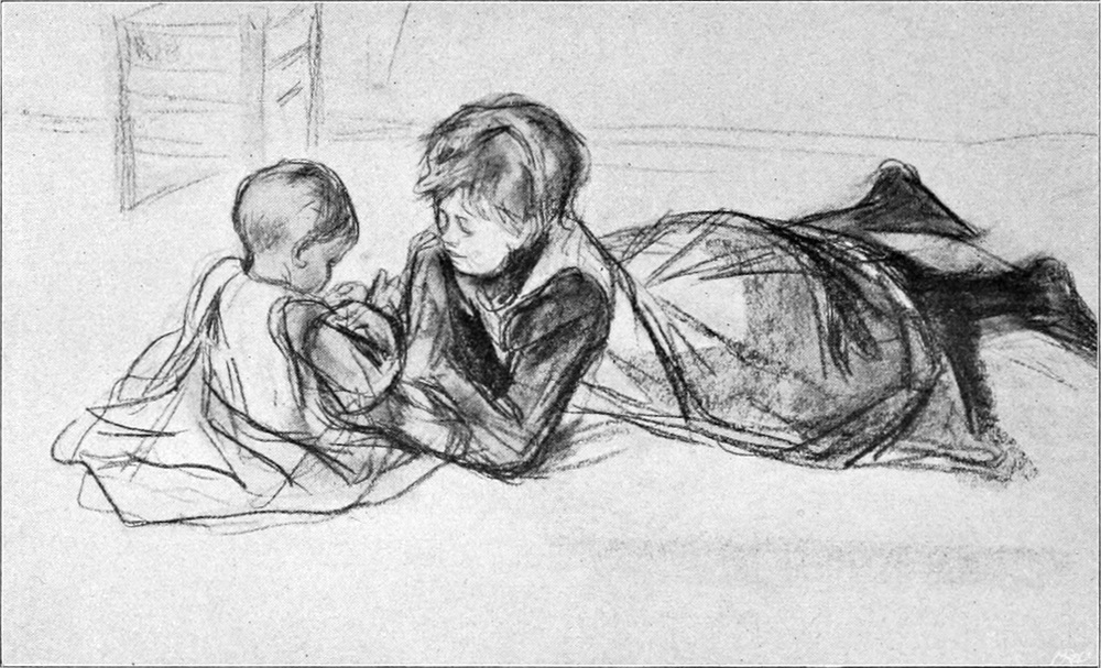 Liebermanns Thätigkeit in Paris und Barbizon gipfelt in dem bald als „Arbeiter im Rübenfelde“, bald als „Im Runkelpark“ bezeichneten großen Bilde (Abb. 7), das als eines seiner Hauptwerke gilt. Der geistige Vater dieses Bildes ist ja wohl ohne Zweifel Millet, aber doch nur insoweit, als der junge Berliner durch diesen großen Künstler auf die wirksame Verbindung und den geistigen Zusammenhang von Mensch und Landschaft hingewiesen wurde. Die Anekdote, von der bis zum Erscheinen Millets das Bauernbild seine Daseinsberechtigung hergenommen, war für Liebermann von vornherein ein überwundener Standpunkt, und ehe er Bilder Millets gesehen, war die Darstellung arbeitender Menschen das, was ihn künstlerisch gereizt hatte. Nun gewann der Mensch als Erscheinung in der Natur für ihn eine tiefere Bedeutung. Sein Gefühl für das Verhältnis der Erscheinung zu ihrer Umgebung erfuhr durch das Beispiel des bewunderten Meisters die erwünschte Bekräftigung. Auch das in Barbizon entstandene Bild ist noch sehr dunkel, von einer schweren, mehr an Courbet als an Millet erinnernden Farbe; aber in der Landschaft und in der Beleuchtung kündigt sich schon ein Neues an. Ungehindert schweift der Blick an ein paar Bäumen vorbei über weite Felder bis zu der hoch gelegenen, von den Gestalten der im Vordergrunde thätigen Arbeiter nicht überschnittenen Horizontlinie. Sechs Weiber[S. 23] und drei Männer schaufeln, jäten und graben auf dem Acker. Zwei der Weiber ruhen, auf ihre Hacken gestützt, aus. In den Figuren ist jede Art von Bewegung dargestellt, die die Feldarbeit erfordert, so daß die mit Ausnahme eines weiter vorgerückten Weibes in einer Reihe Arbeitenden für die Betrachtung reiche Abwechselung bieten. Vielleicht aber ist dieses Werk das einzige Liebermanns, bei dem man einen gewissen Mangel an Frische und Unmittelbarkeit nachweisen könnte. Es zeigt des Malers ganzes großes Können, aber es hat weniger Natürlichkeit als seine sonstigen Bilder. Die Figuren sind zu nahe bei einander, und einige posieren, was bei Liebermann sonst nie vorkommt. Das Programmatische stört. Unter der Wirkung von Millet stehen auch zwei größere Skizzen, die je einen Mann und eine Frau in einem Kartoffelacker arbeitend zeigen. Hinter beiden Figuren sieht man dieselbe braunbewachsene Böschung, über beiden den gleichen grauen Oktoberhimmel. Die außerordentliche Einfachheit des Motives, die wenigen Farben bringen diese Studien ähnlichen Schöpfungen des Meisters von Barbizon ganz nahe. Aber schon in den „Geschwistern“ (Abb. 8) ist Liebermann wieder frei von allen Erinnerungen und ganz er selbst. Wie ausgezeichnet ist die Haltung und Bewegung des halbwüchsigen Mädchens gesehen, dem die Last des kleinen Bruders zu schwer geworden, und das sich das Gewicht zu erleichtern sucht, indem es das linke Knie hochzieht und damit das Kind stützt! Ein Lichtstrahl, der den Kopf des Mädchens streift und das Gesicht des Kindes voll beleuchtet, gibt Modellierung und farbige Gegensätze. Die Annäherung an Franz Hals spürt man bei den Schöpfungen dieser Zeit wohl am lebhaftesten bei dem Bilde „Mutter und Kind“ (Abb. 10), das schon ins Monumentale gesteigerte Intimität ver[S. 24]rät und mit einer geradezu verblüffenden Kraft und Breite hingestrichen ist.